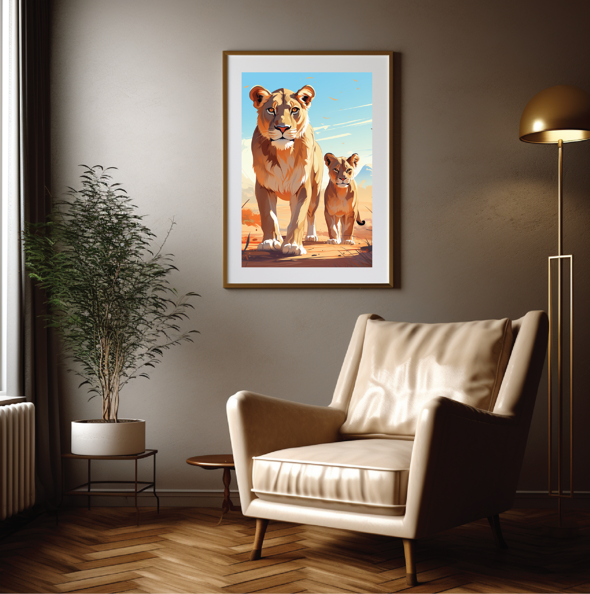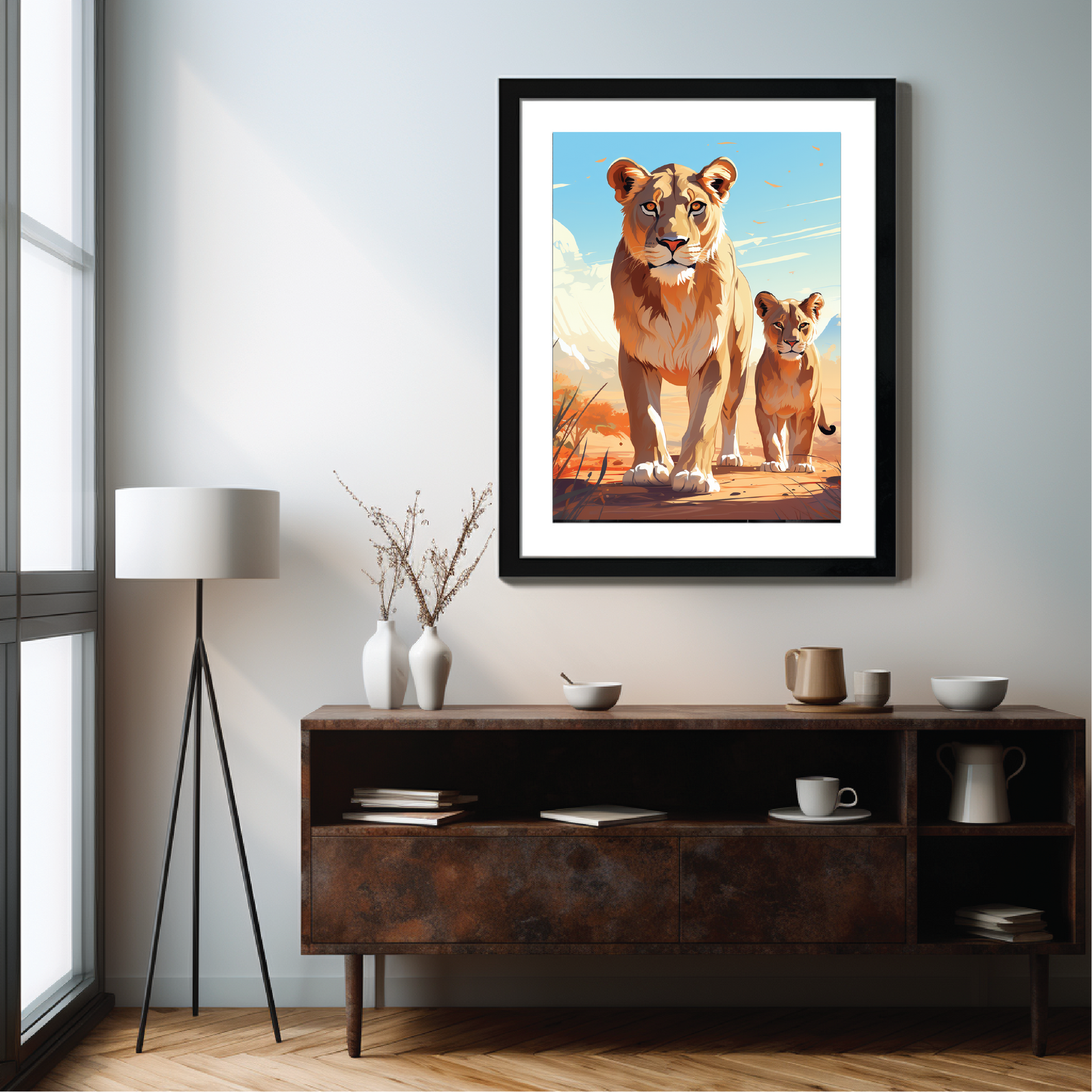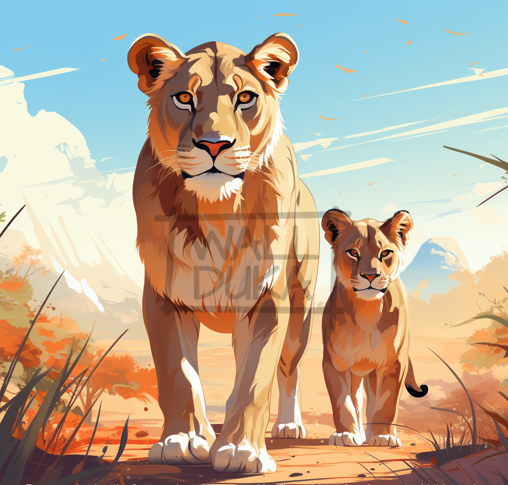 A drawing of a lioness and its cub in the wild, inspired by Taiyō Matsumoto.
