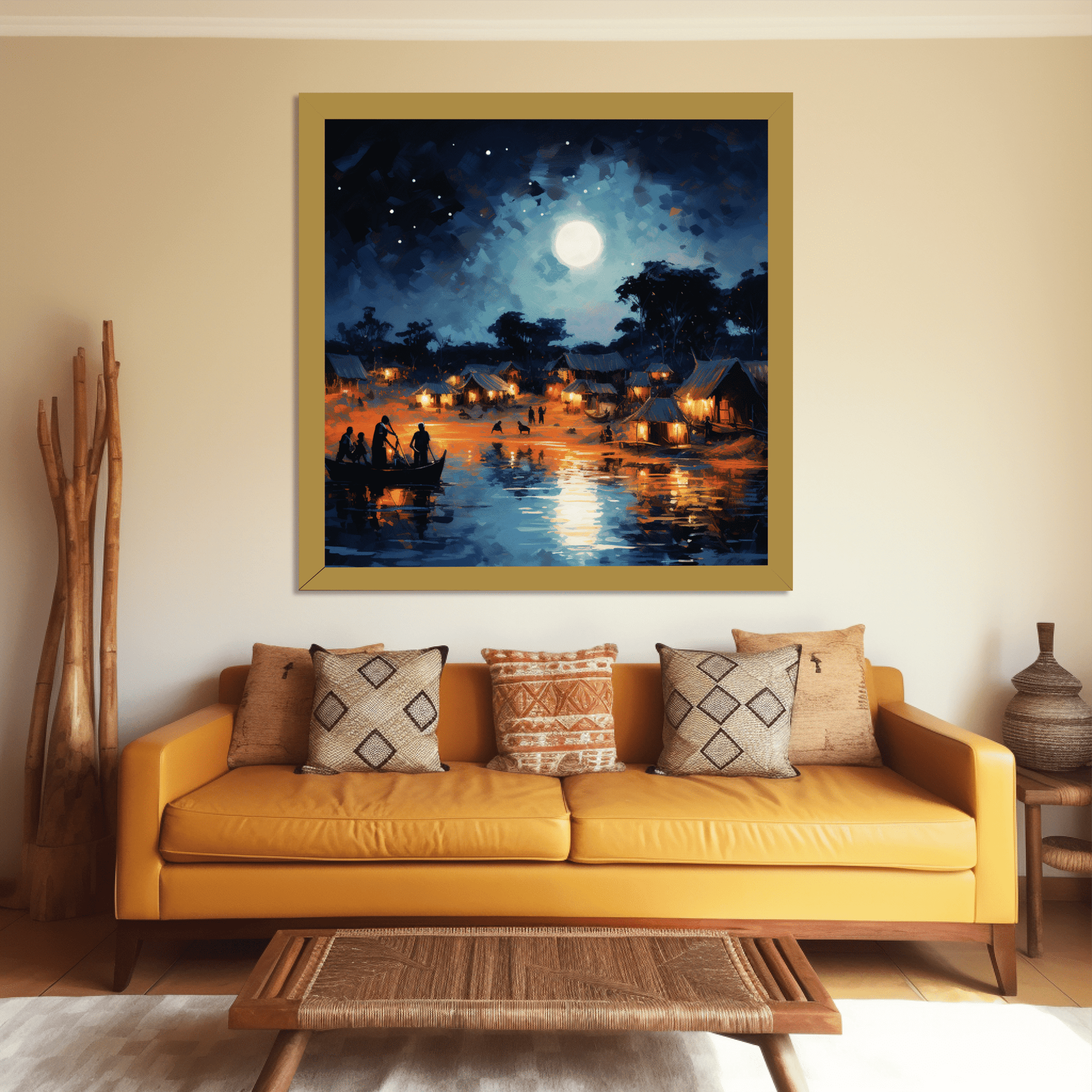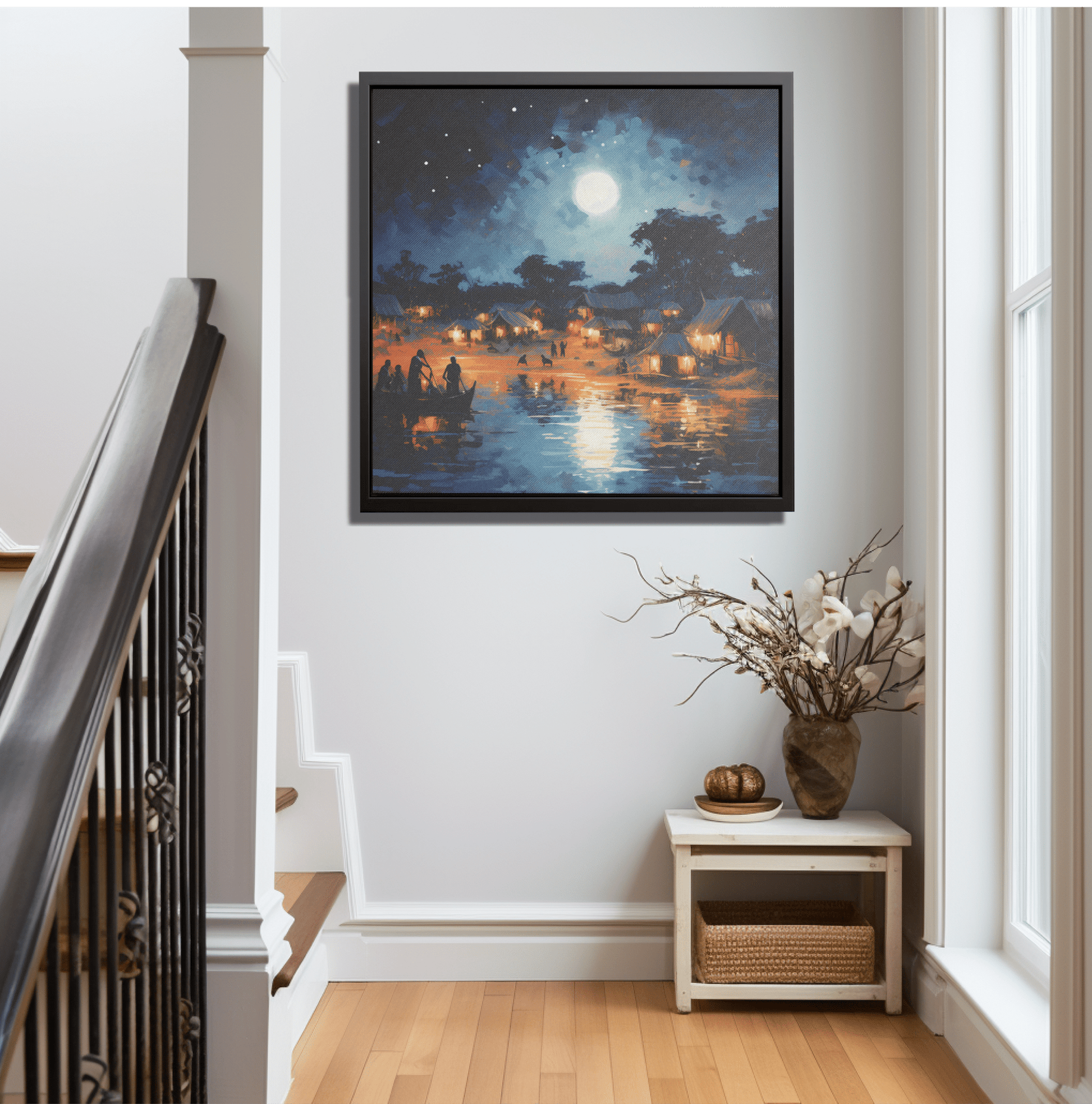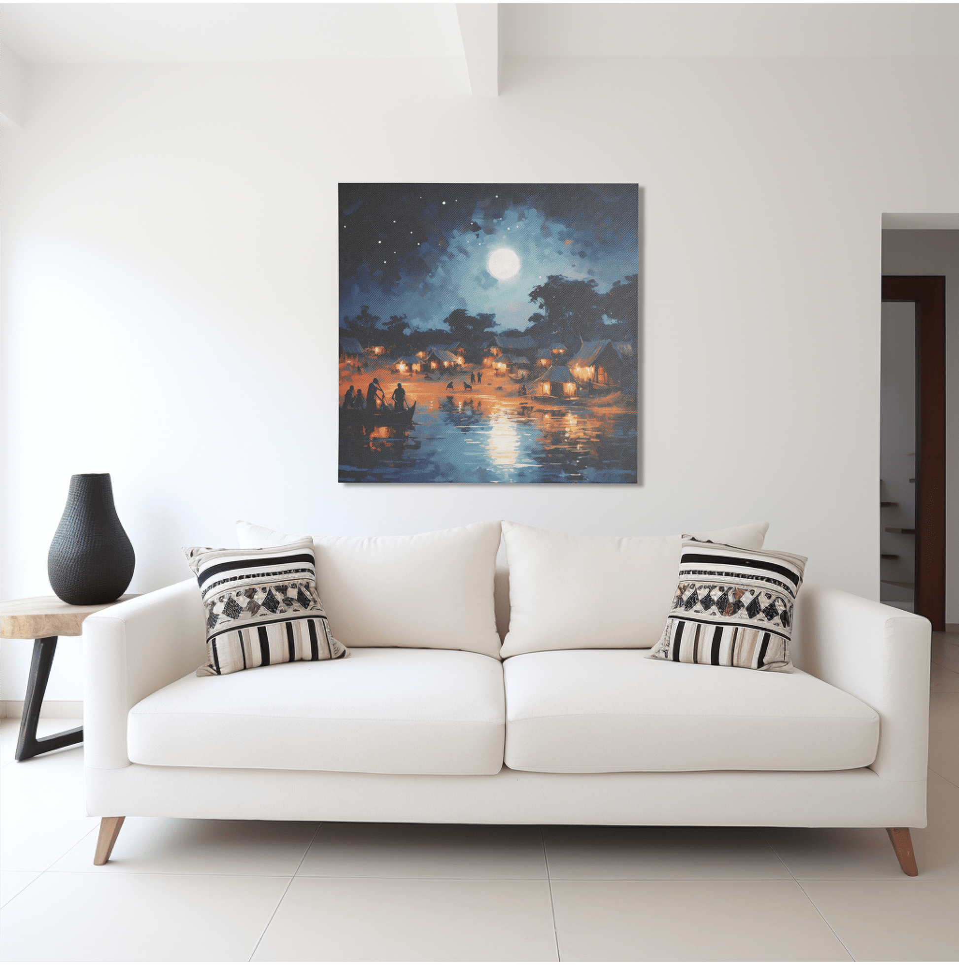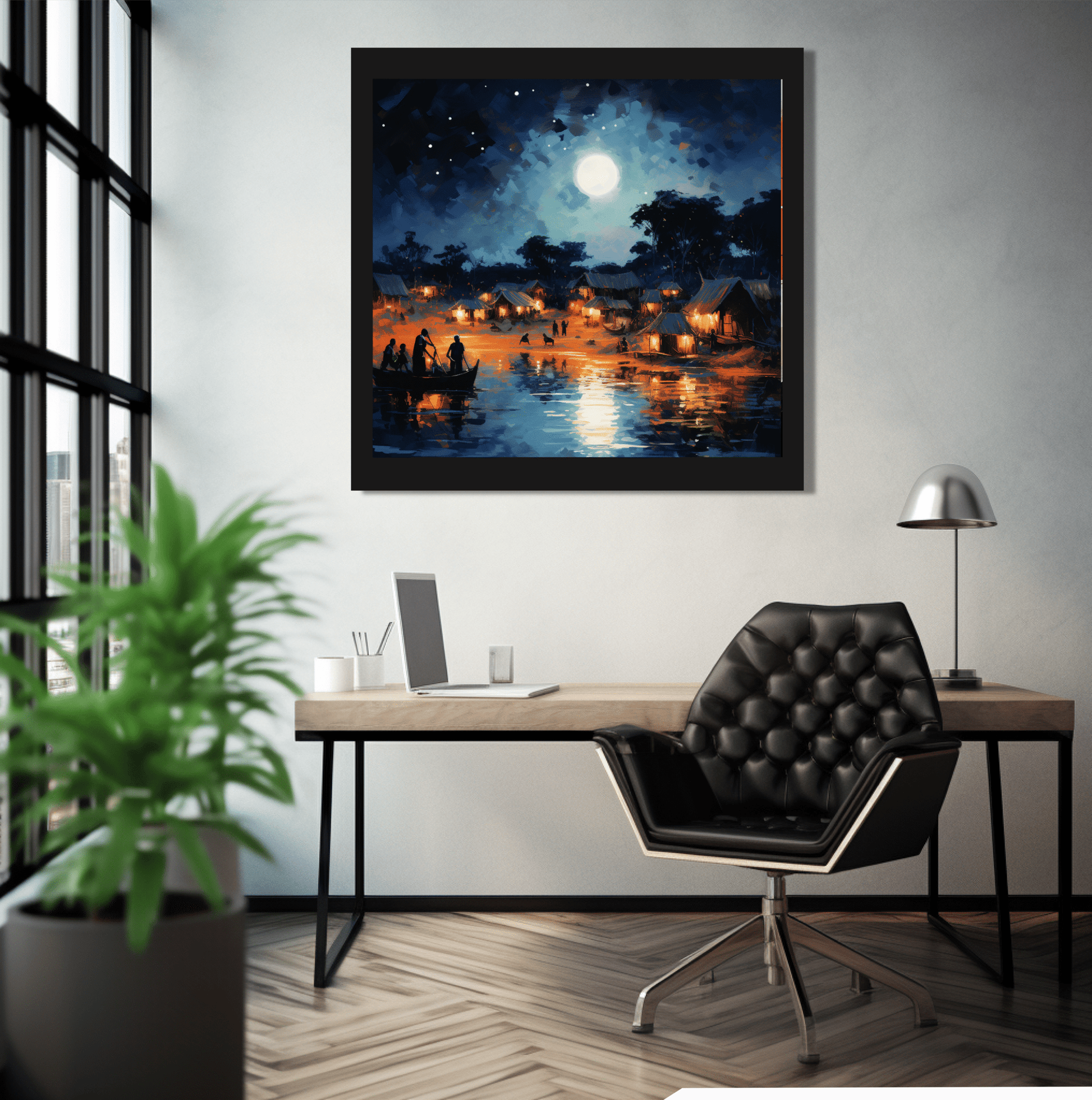Four people on a boat at night with village homes in the background in the style of Claude Monet.