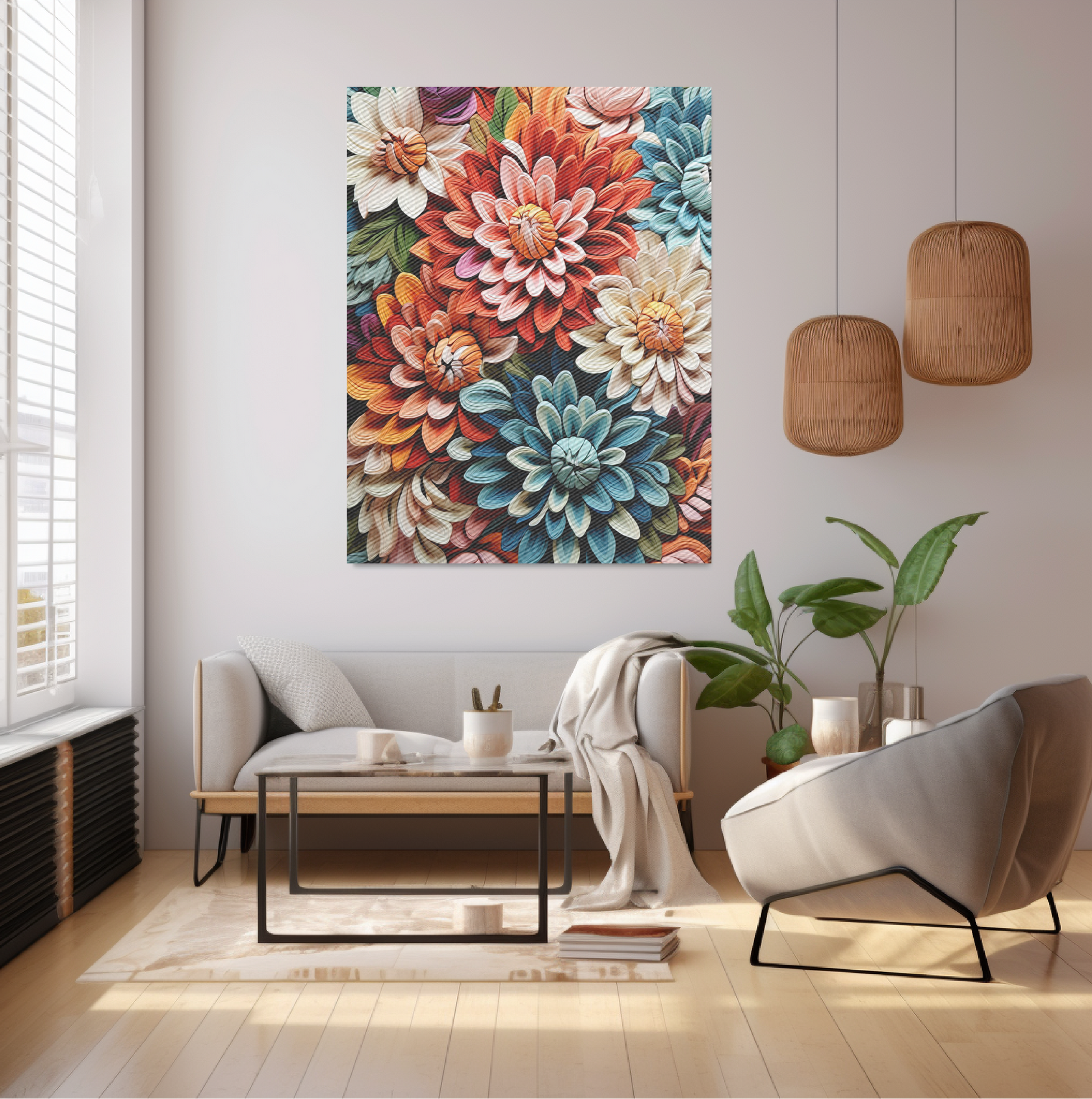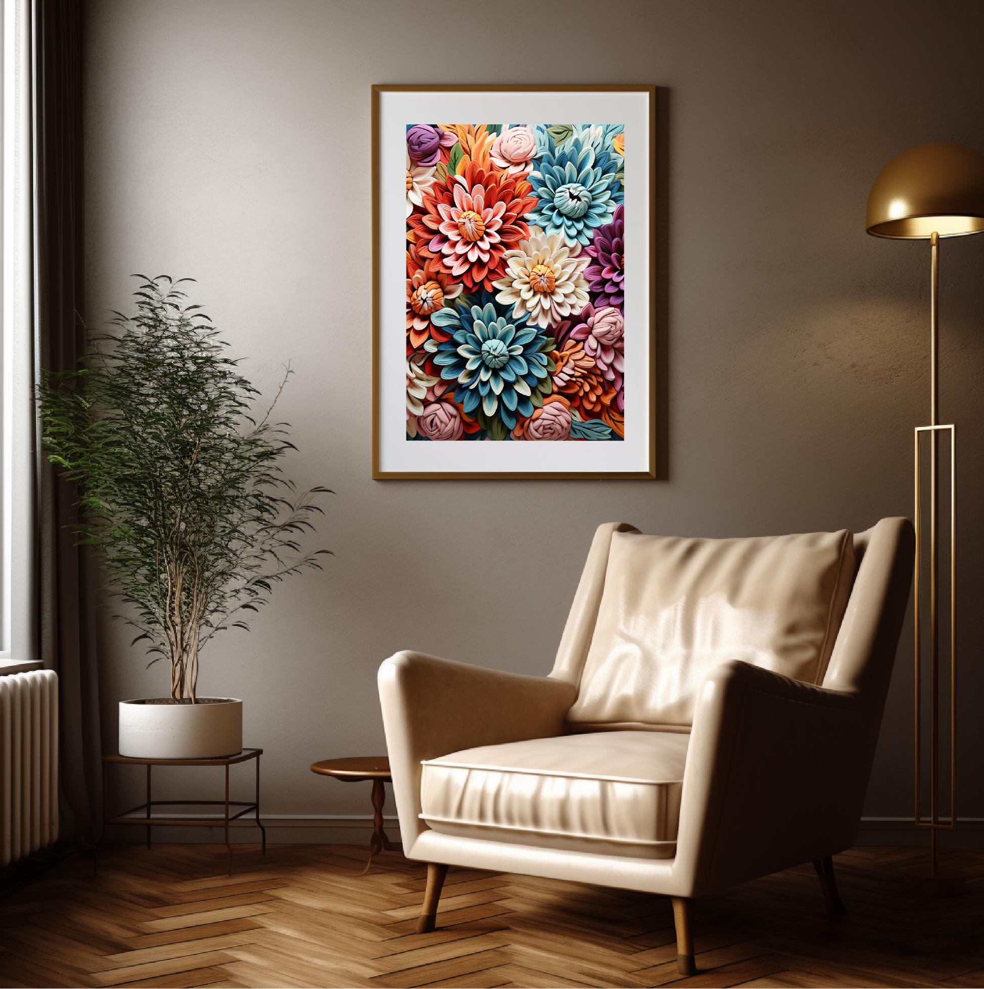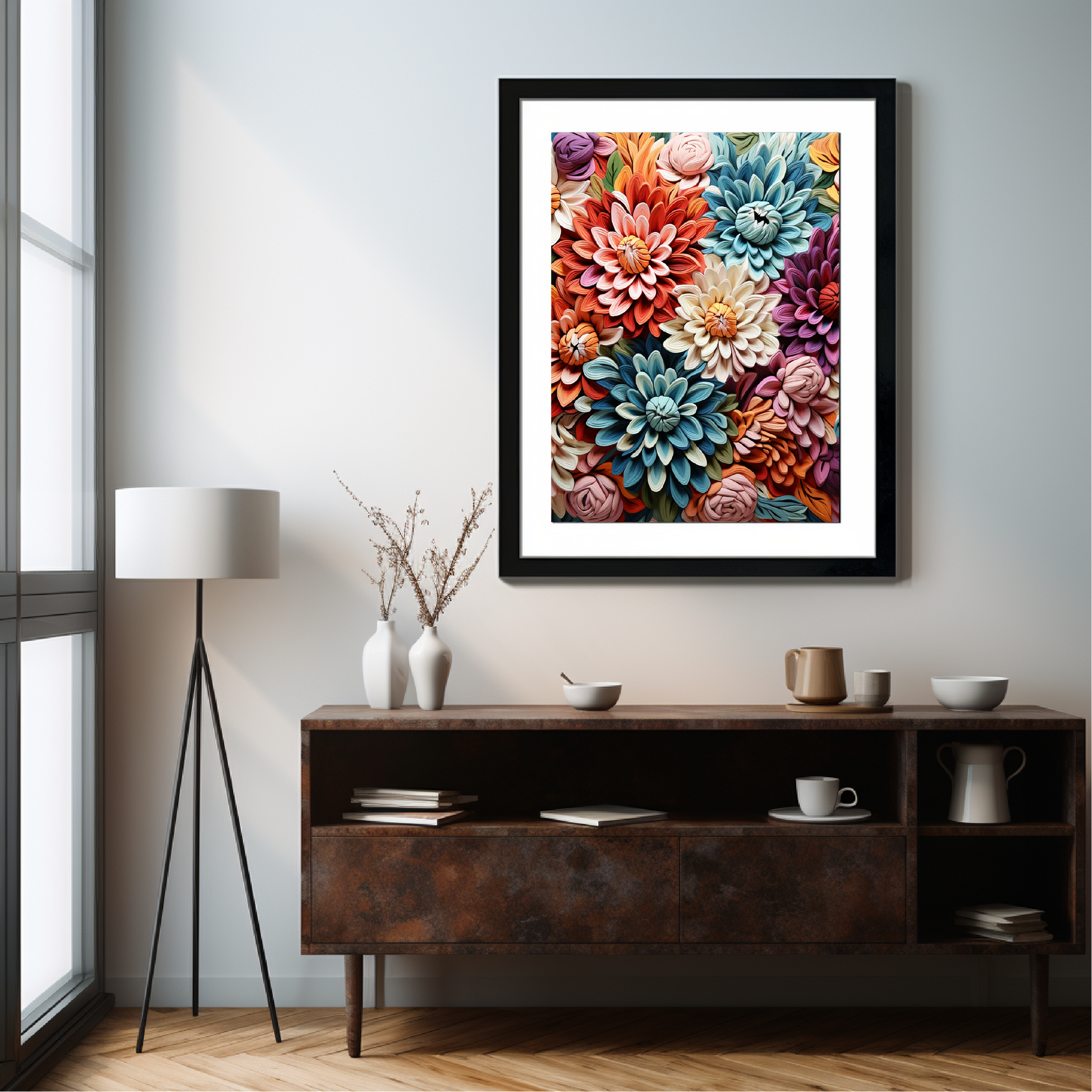 Colorful flowers in a mosaic style pattern and many different colors and designs, in the style of hyper-realistic sculptures, felt creations, dreamlike installations, textured canvases, soft, muted color palette, vibrant compositions.