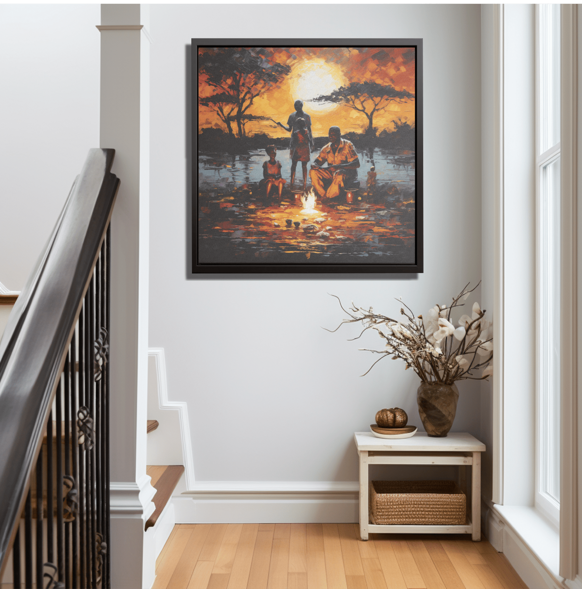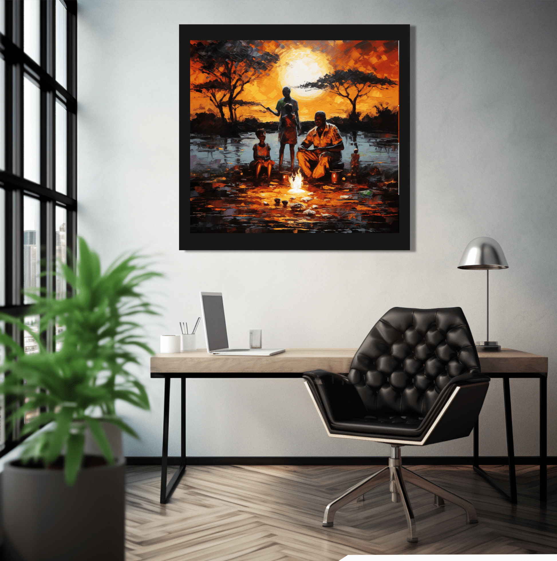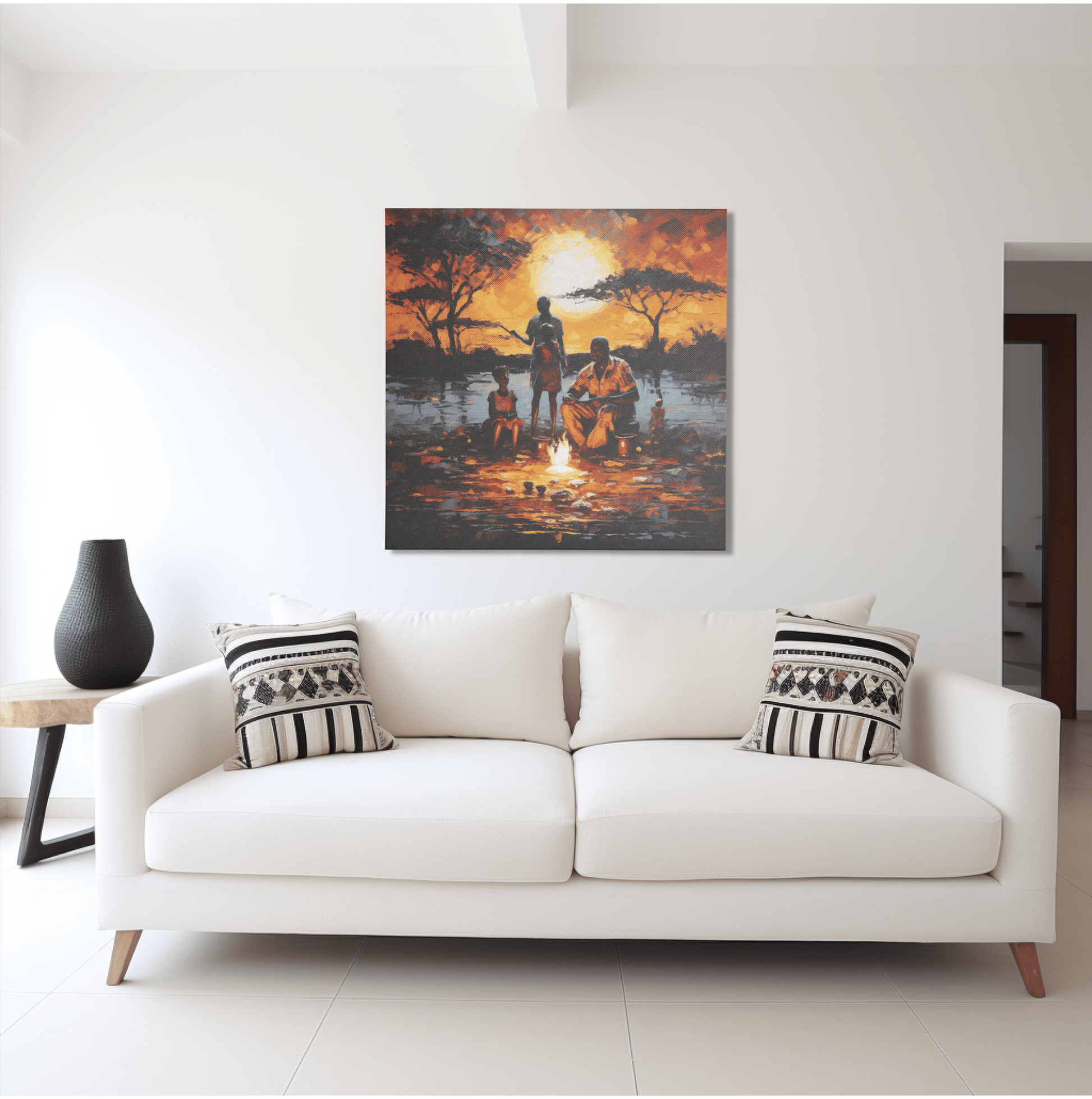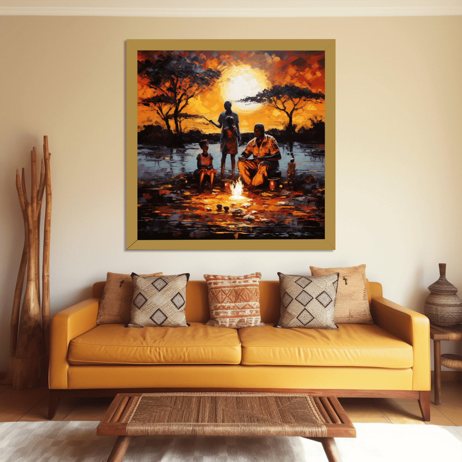 Family painting by the fire with moon and sky in the style of Claude Monet.