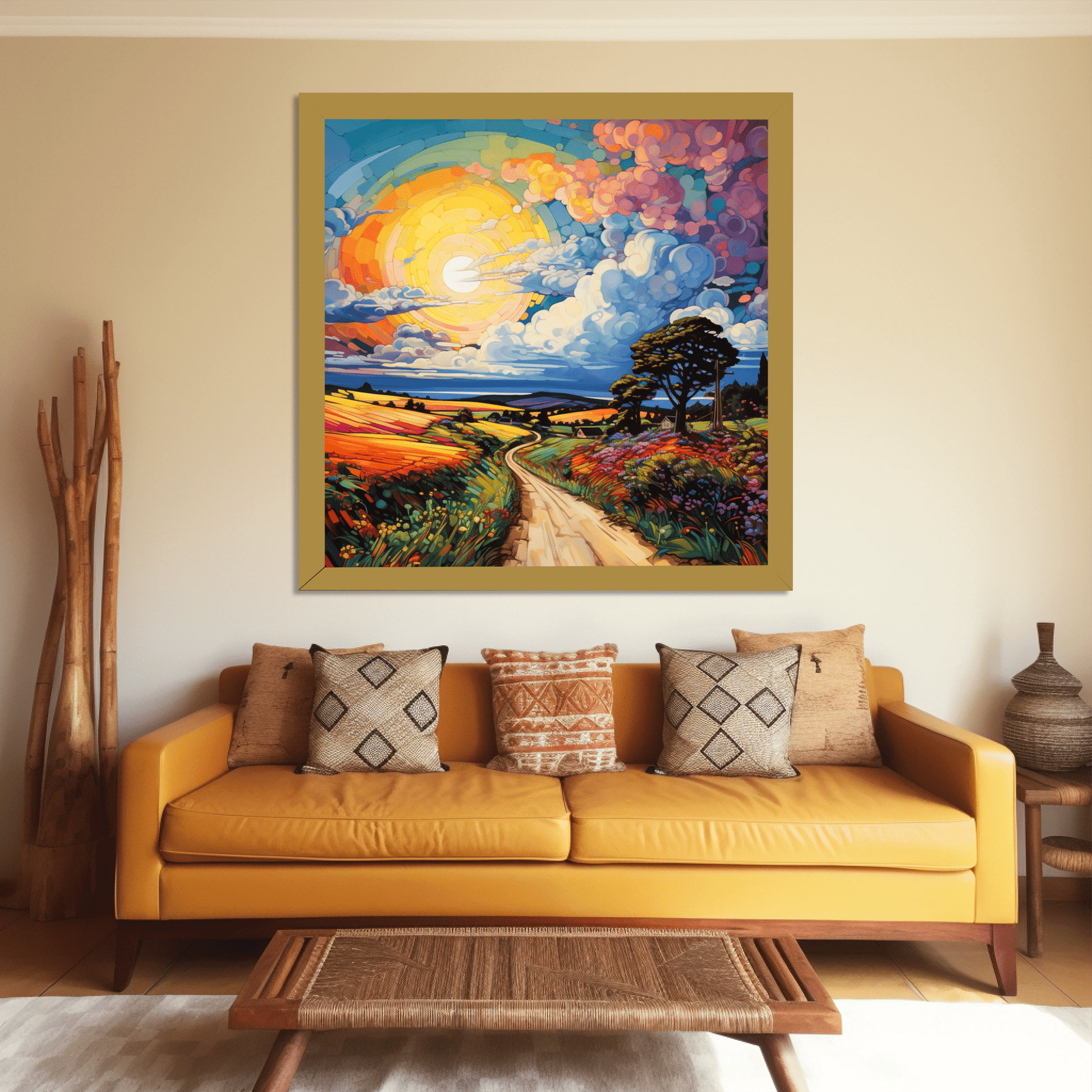 Traveling down road, view of the sky and horizon, greenery, fauvism.