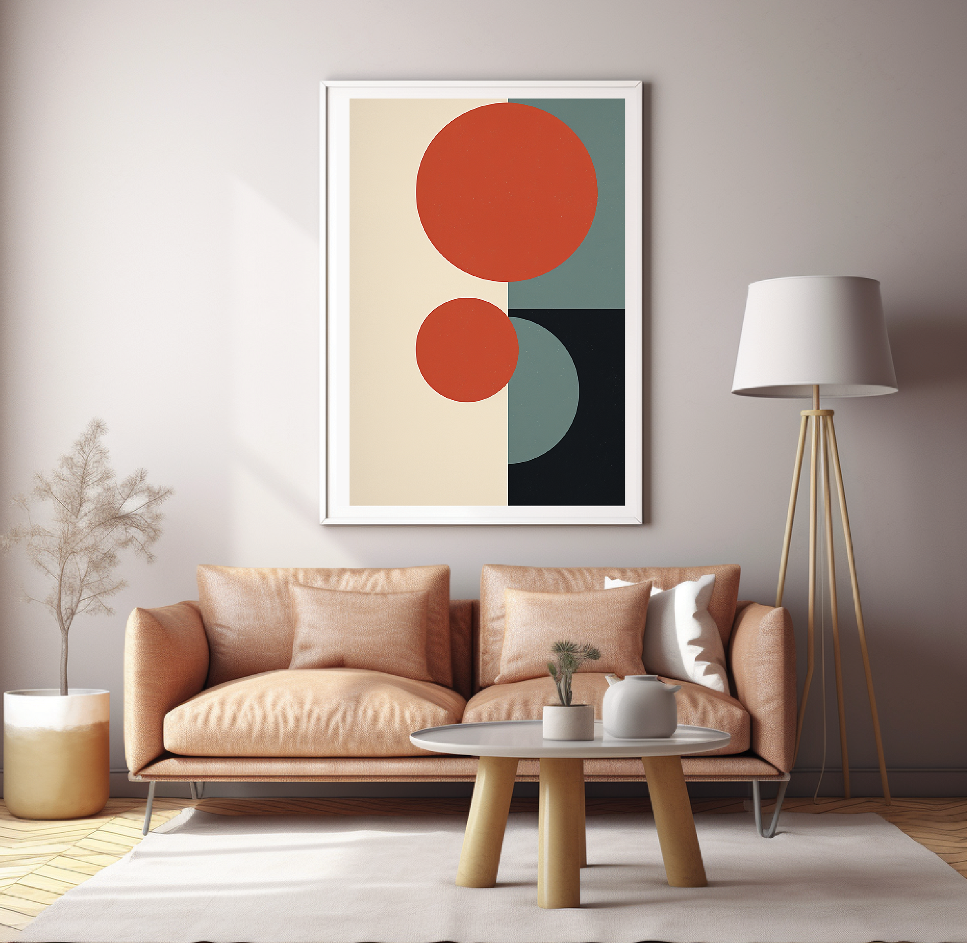 A poster illustrated with circles in various colors and red, in the style of dark teal and dark beige, minimalist geometric forms, light orange and black, monochromatic paintings, animated shapes, symmetrical balance.