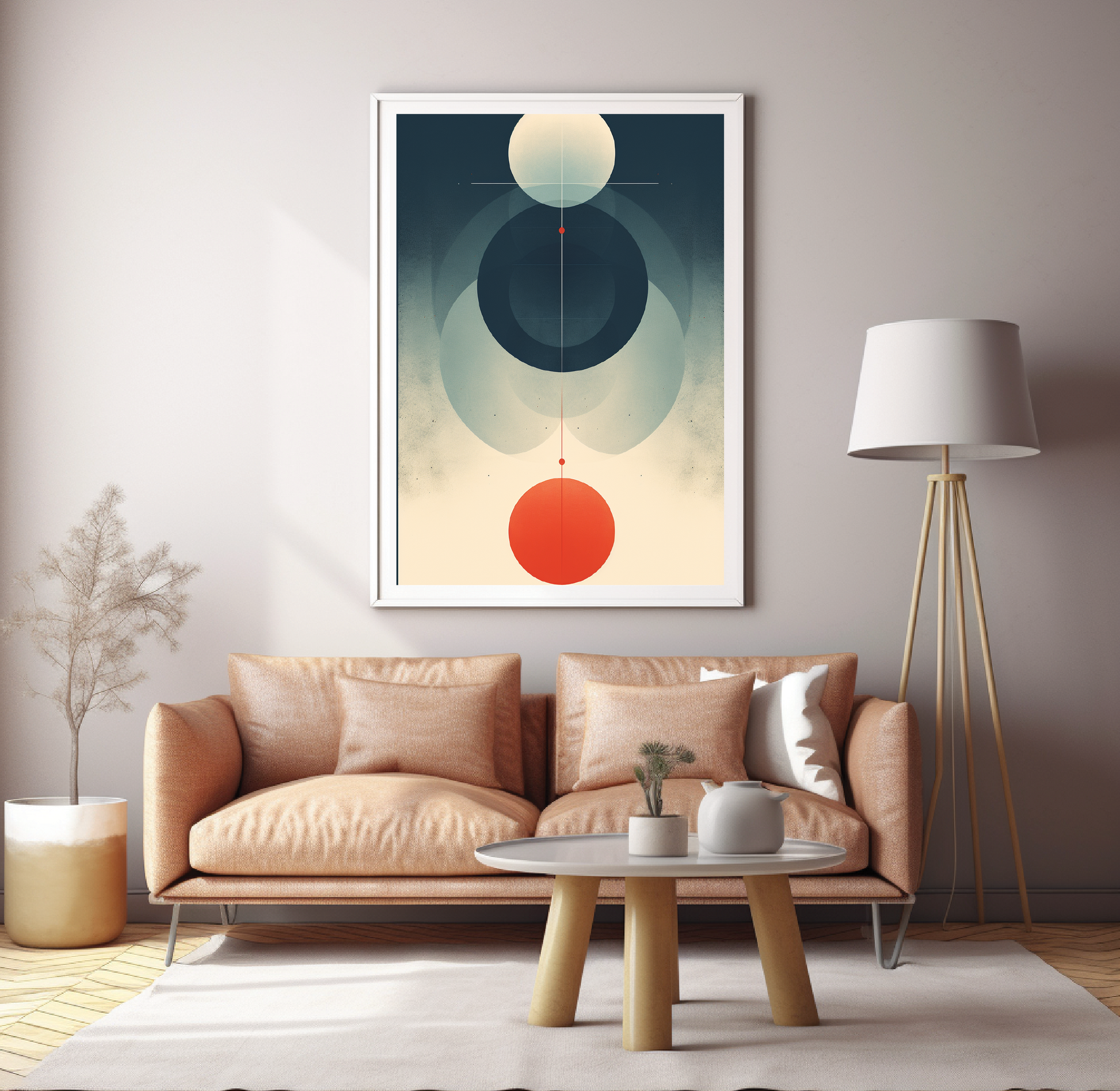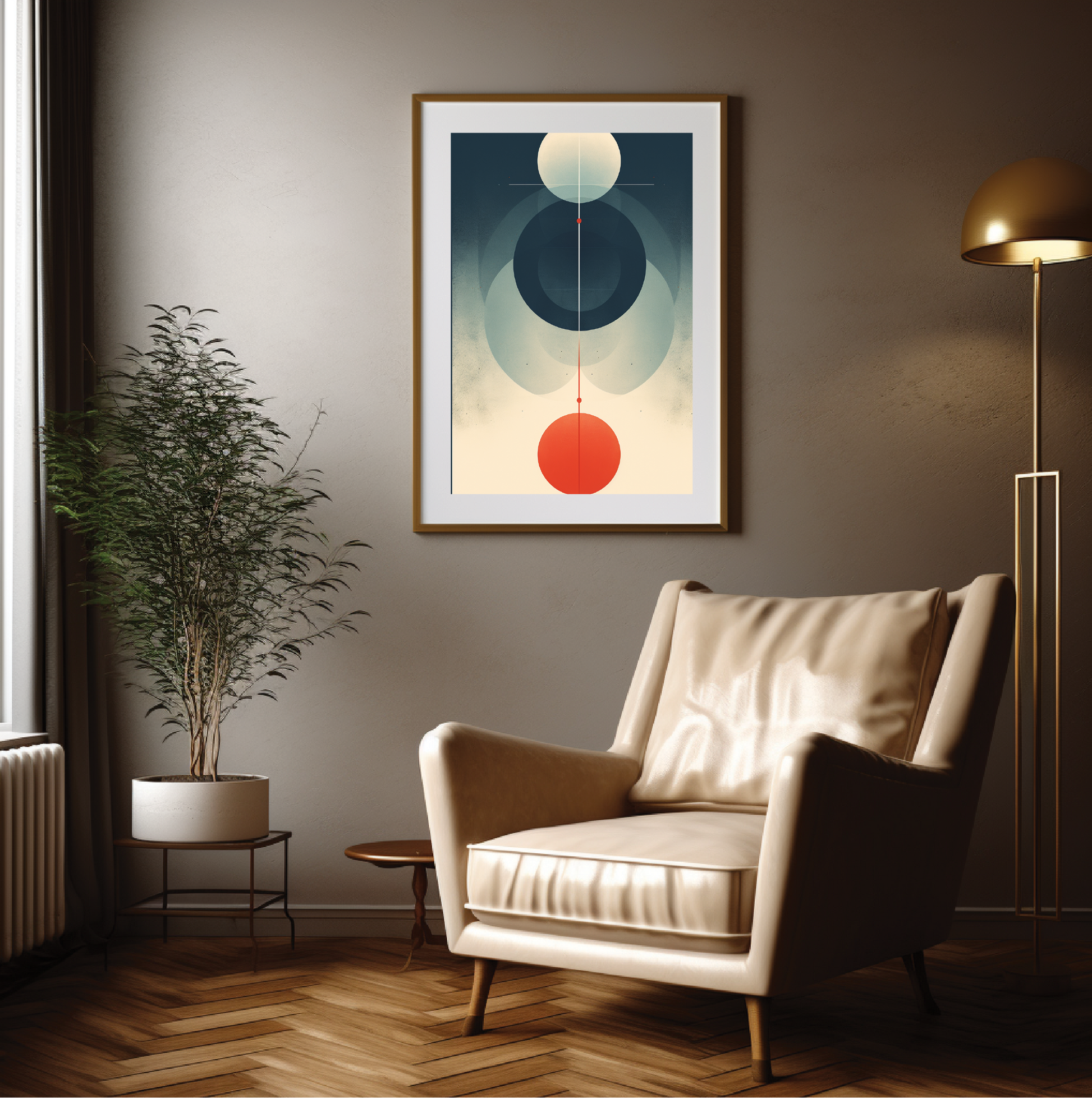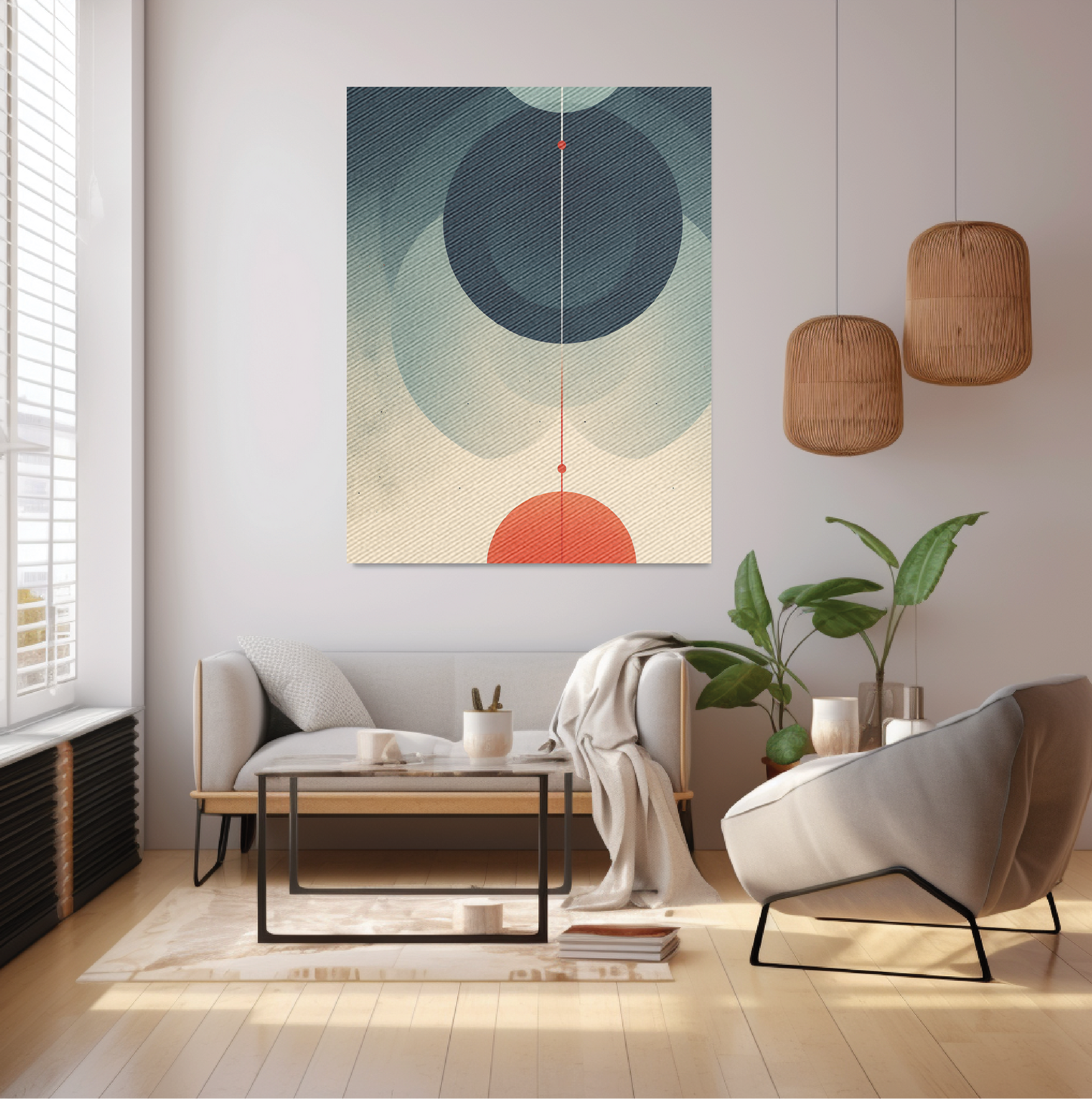 Modern typographic poster about an object shaped like a ball on the wall, in the style of dark sky-blue and light red, precisionist lines and shapes, faded palates, circular shapes