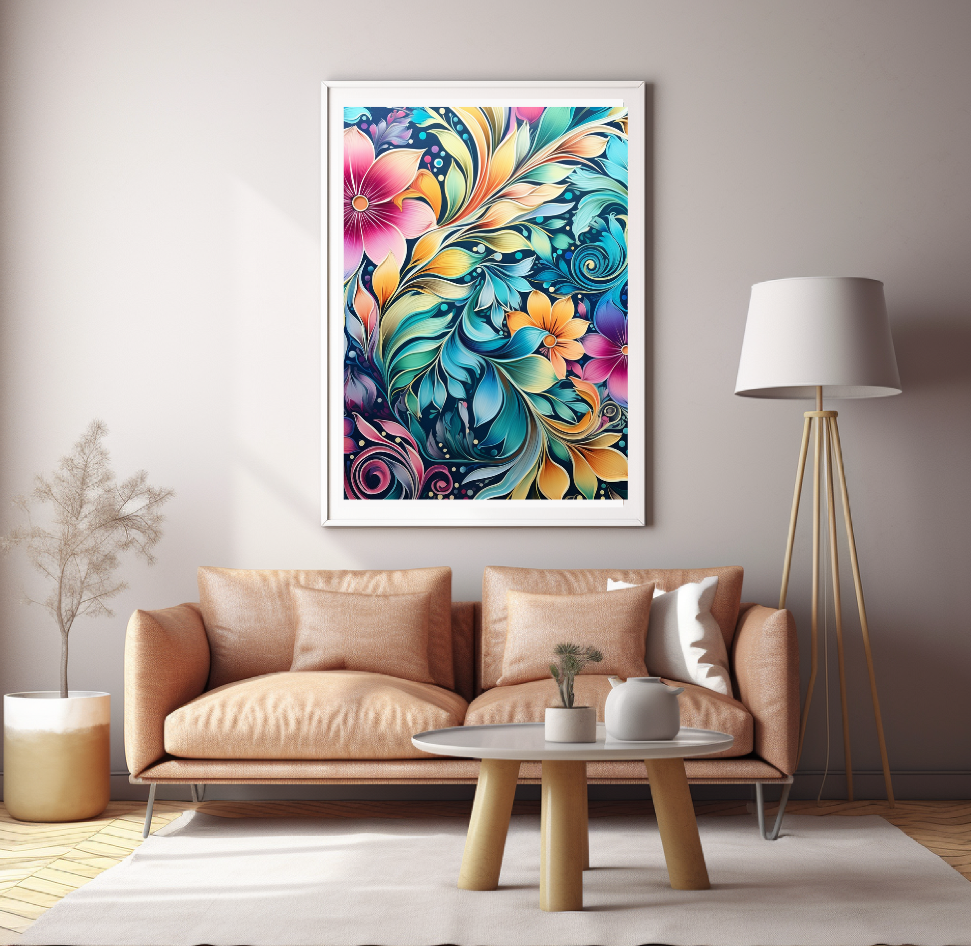 Colorful floral design on a dark background, in the style of graffiti folklore, airbrushing, monochromatic paintings, shaped canvas, colorful moebius and hand-coloring