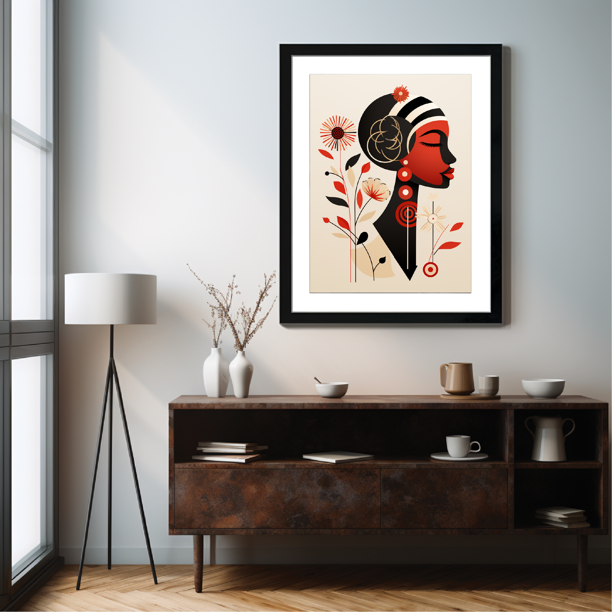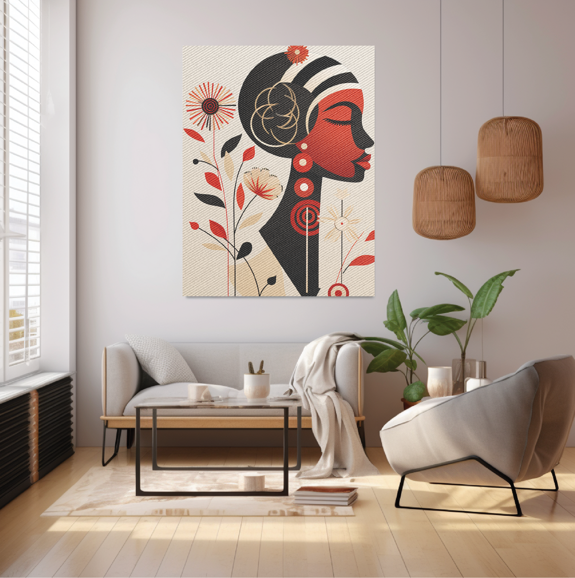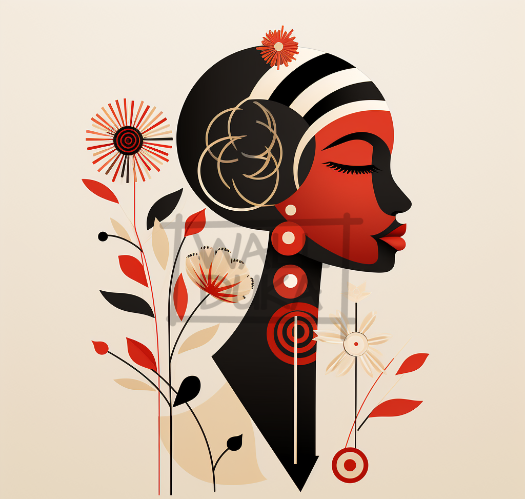 A portrait of a woman with flowers and plants, in the style of traditional African art, deco-inspired geometric forms with red and beige, serene faces, flowing silhouettes and a mix of masculine and feminine elements.