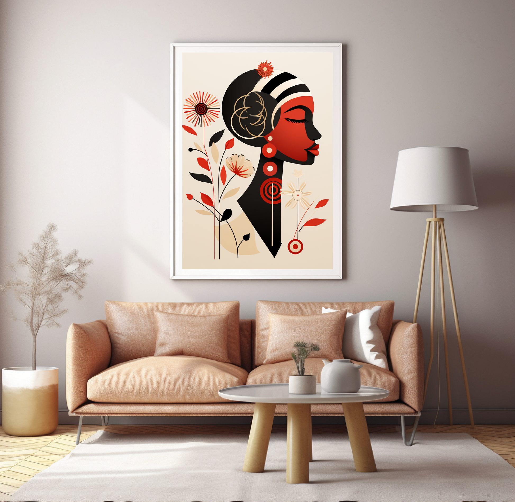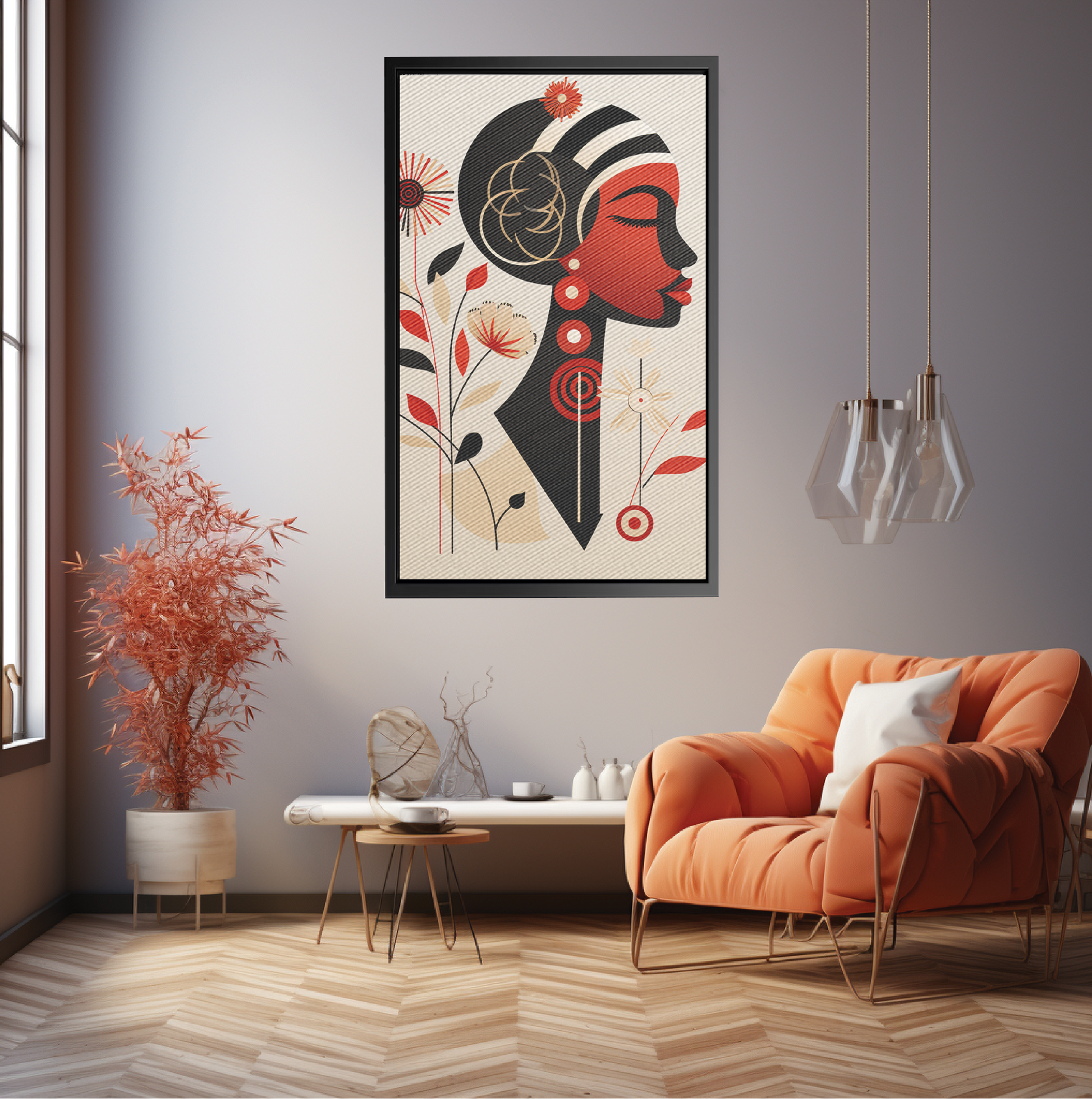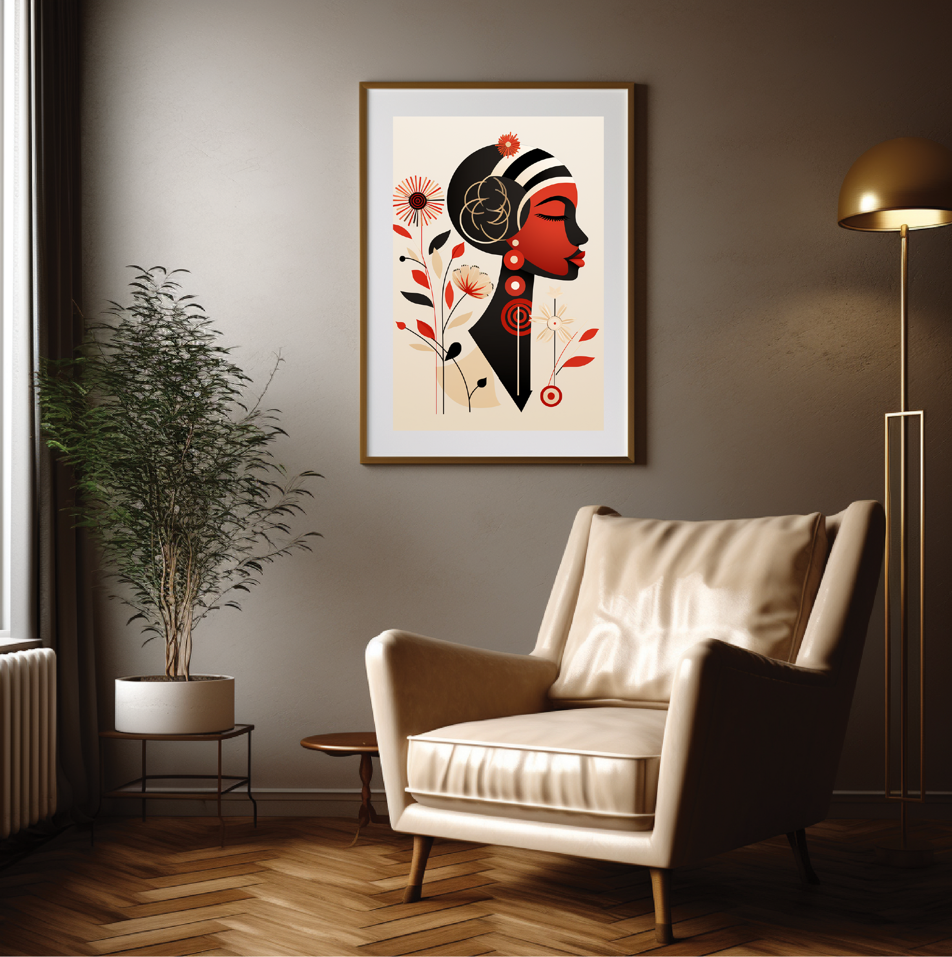 A portrait of a woman with flowers and plants, in the style of traditional African art, deco-inspired geometric forms with red and beige, serene faces, flowing silhouettes and a mix of masculine and feminine elements.