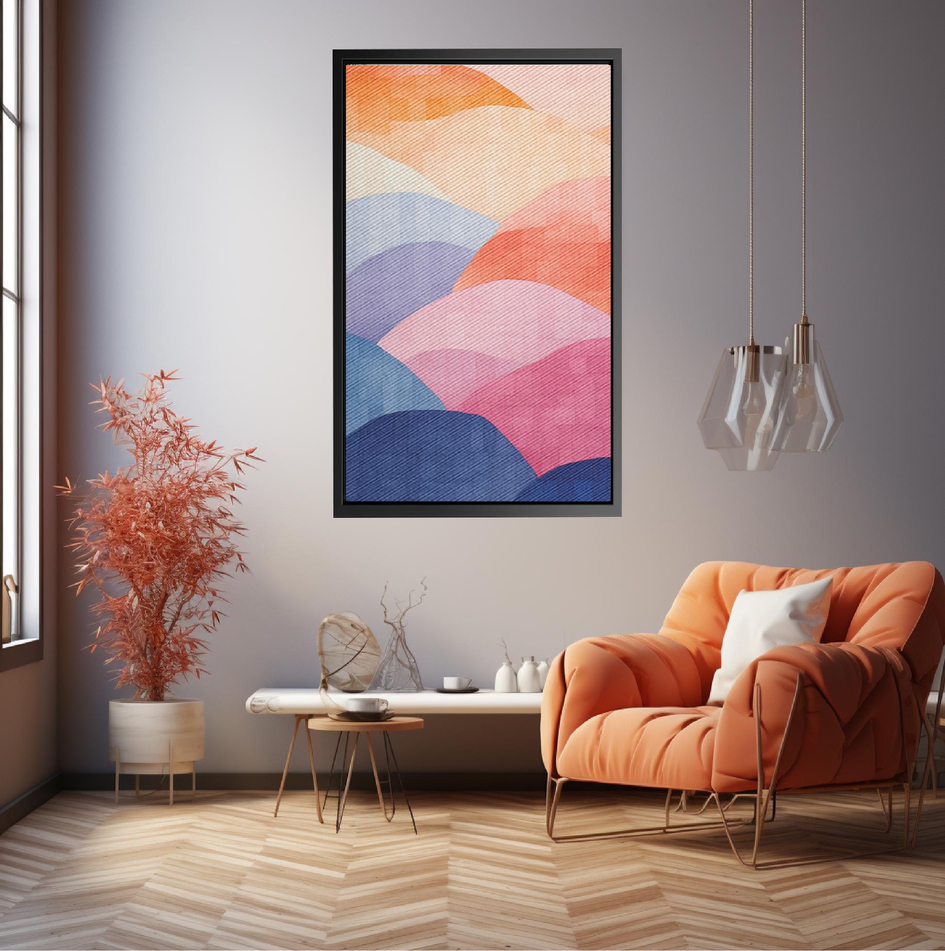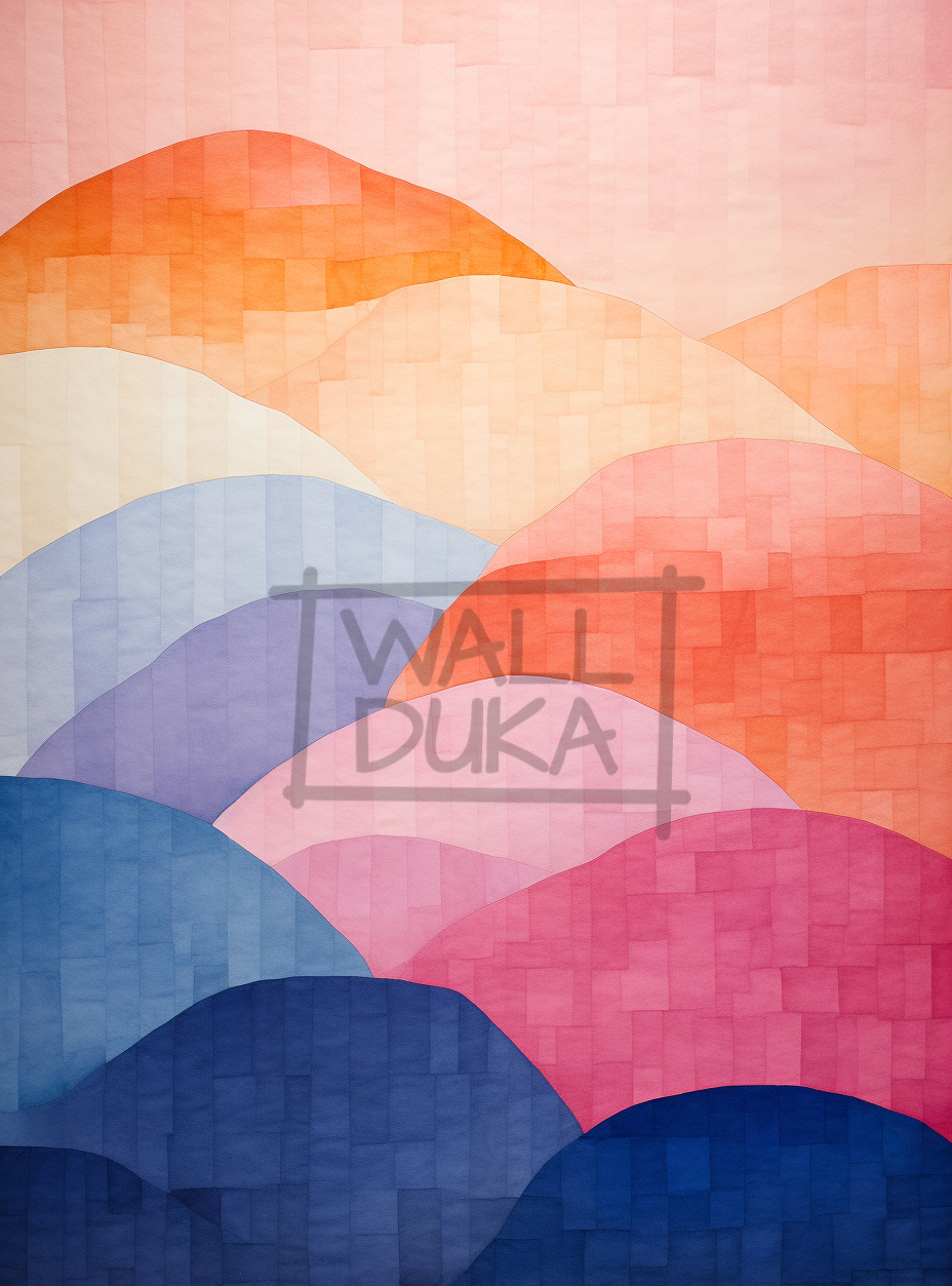 Abstract background in blue, pink, orange and yellow colors, in the style of Japanese minimalism, large scale installations, mountainous vistas, textile installation, delicate paper cutouts, monochromatic landscapes, atmospheric watercolors.