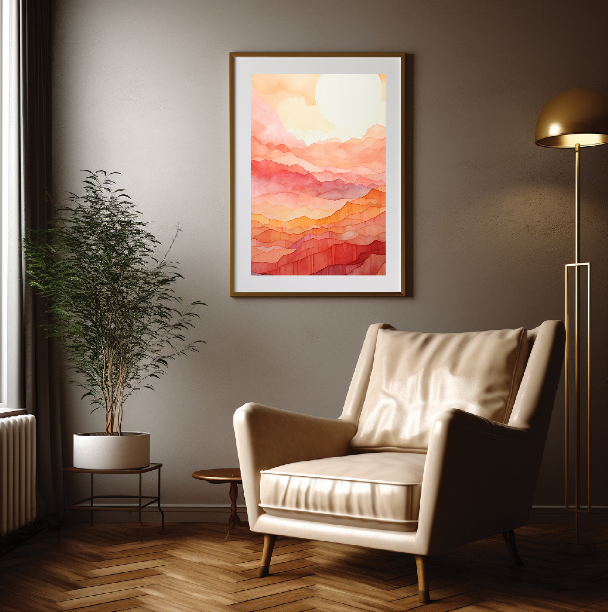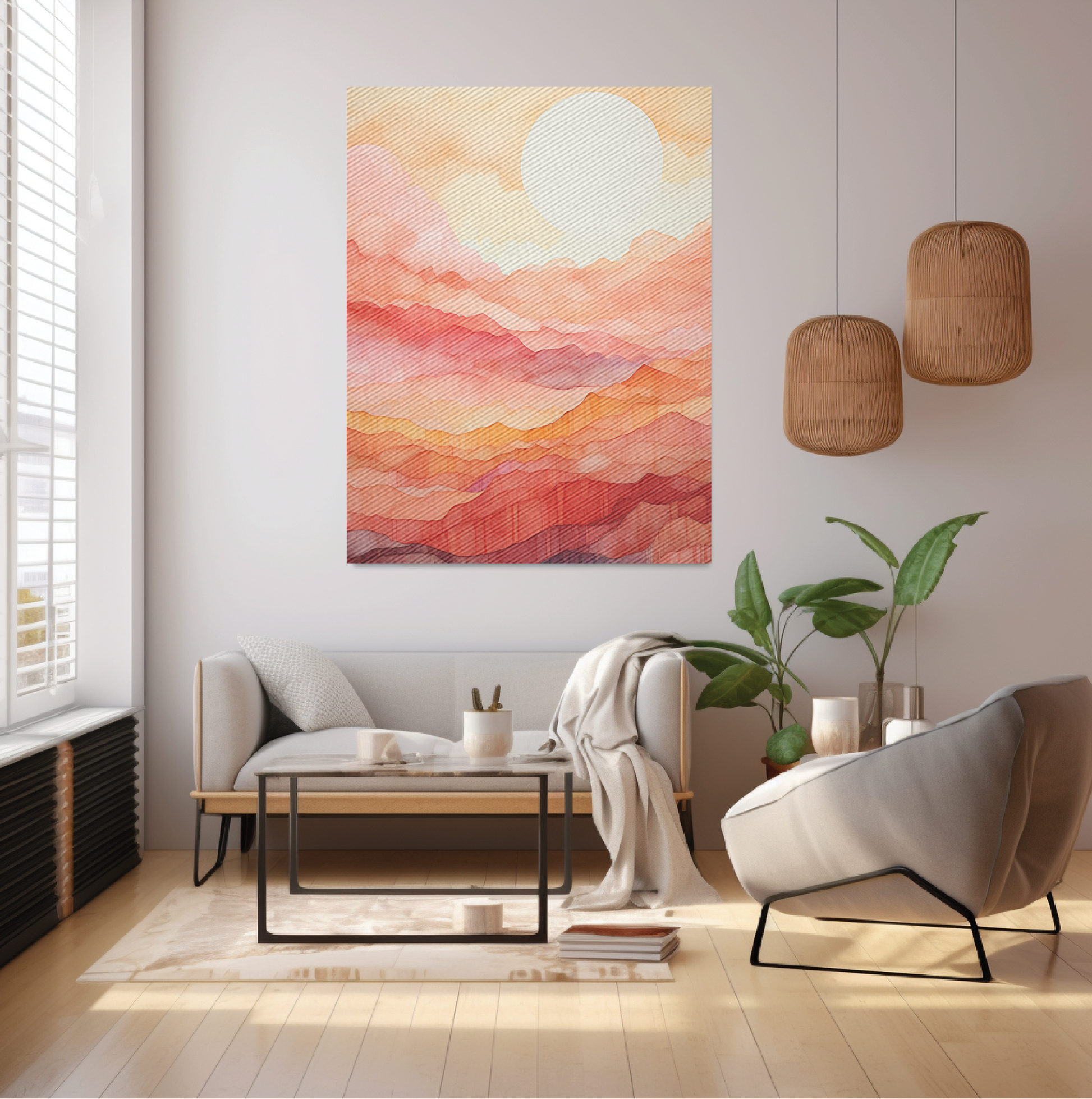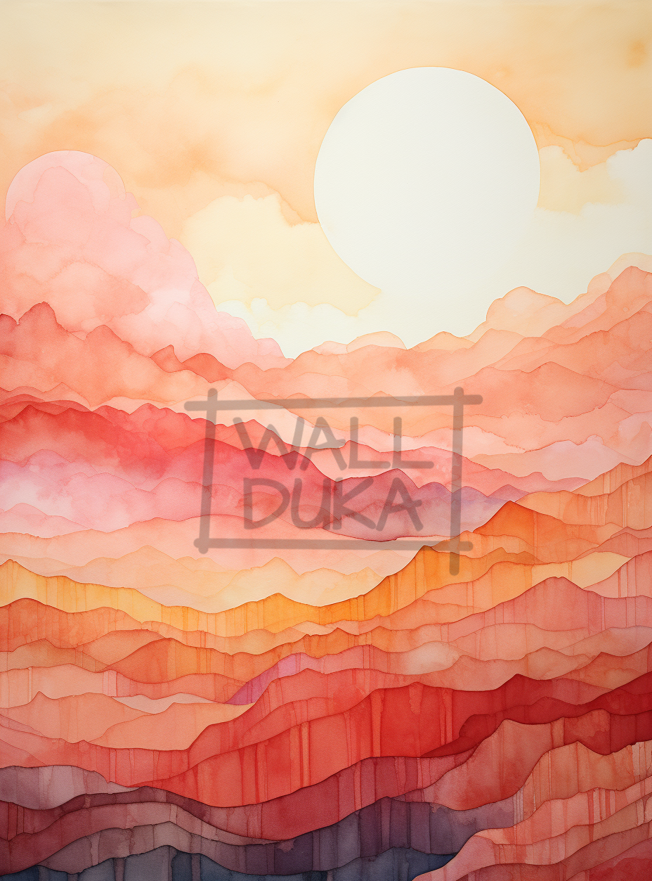 A watercolor painting of mountains below a stormy sky, in the style of light orange and light crimson, generative art, naturalistic landscape backgrounds, layered lines, soft gradients, mural painting, warm color palette.