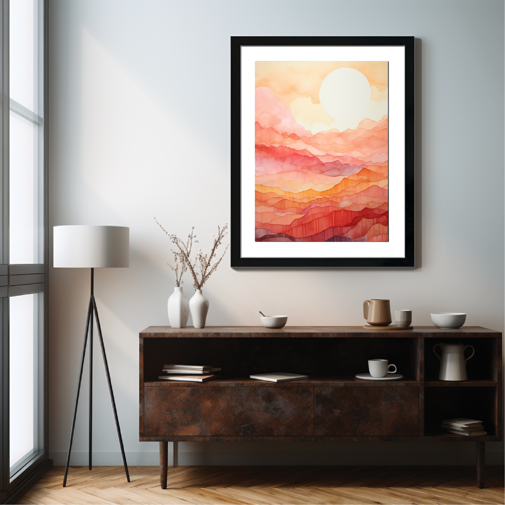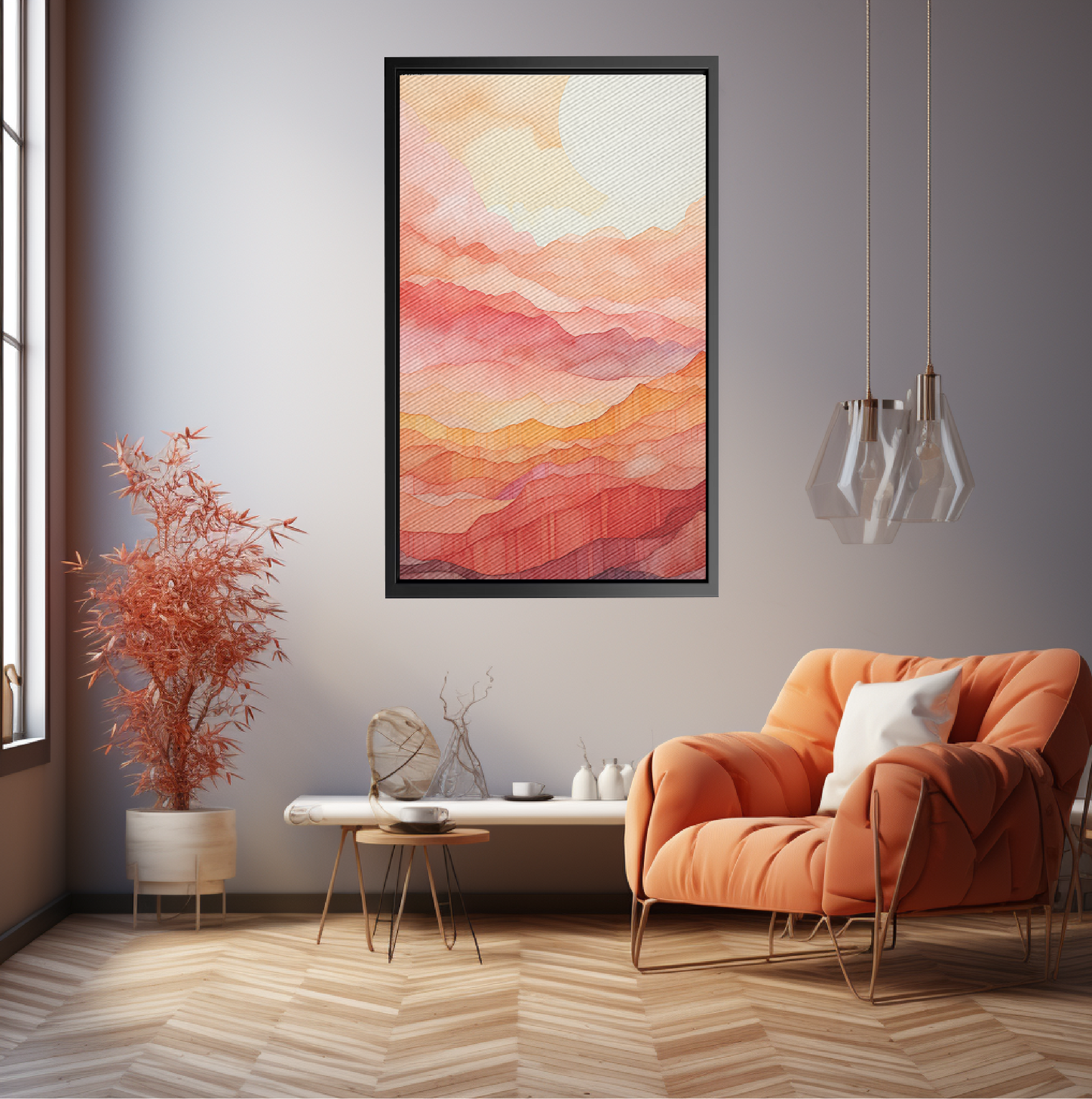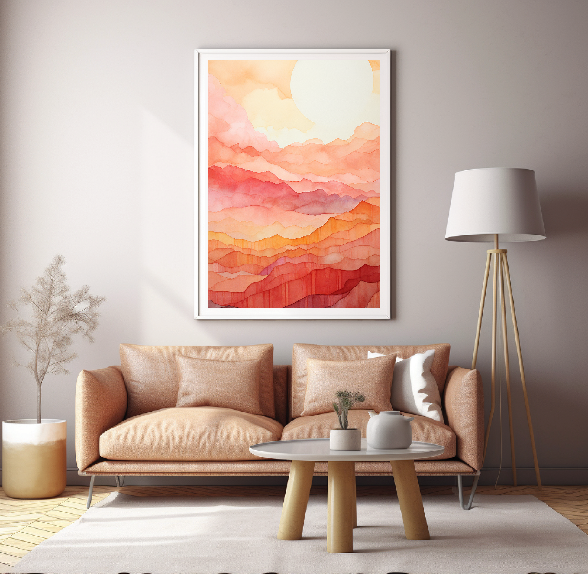 A watercolor painting of mountains below a stormy sky, in the style of light orange and light crimson, generative art, naturalistic landscape backgrounds, layered lines, soft gradients, mural painting, warm color palette.