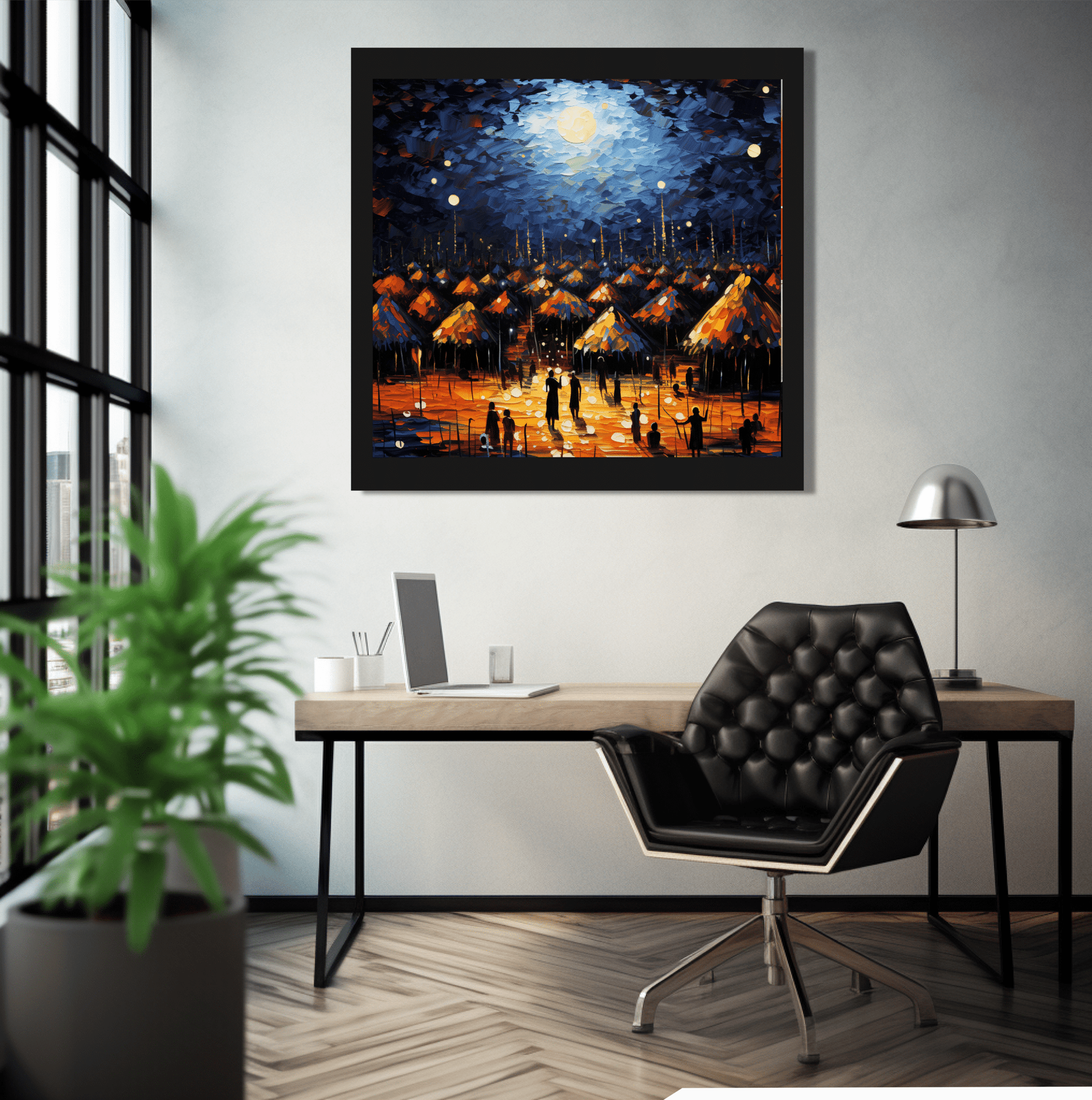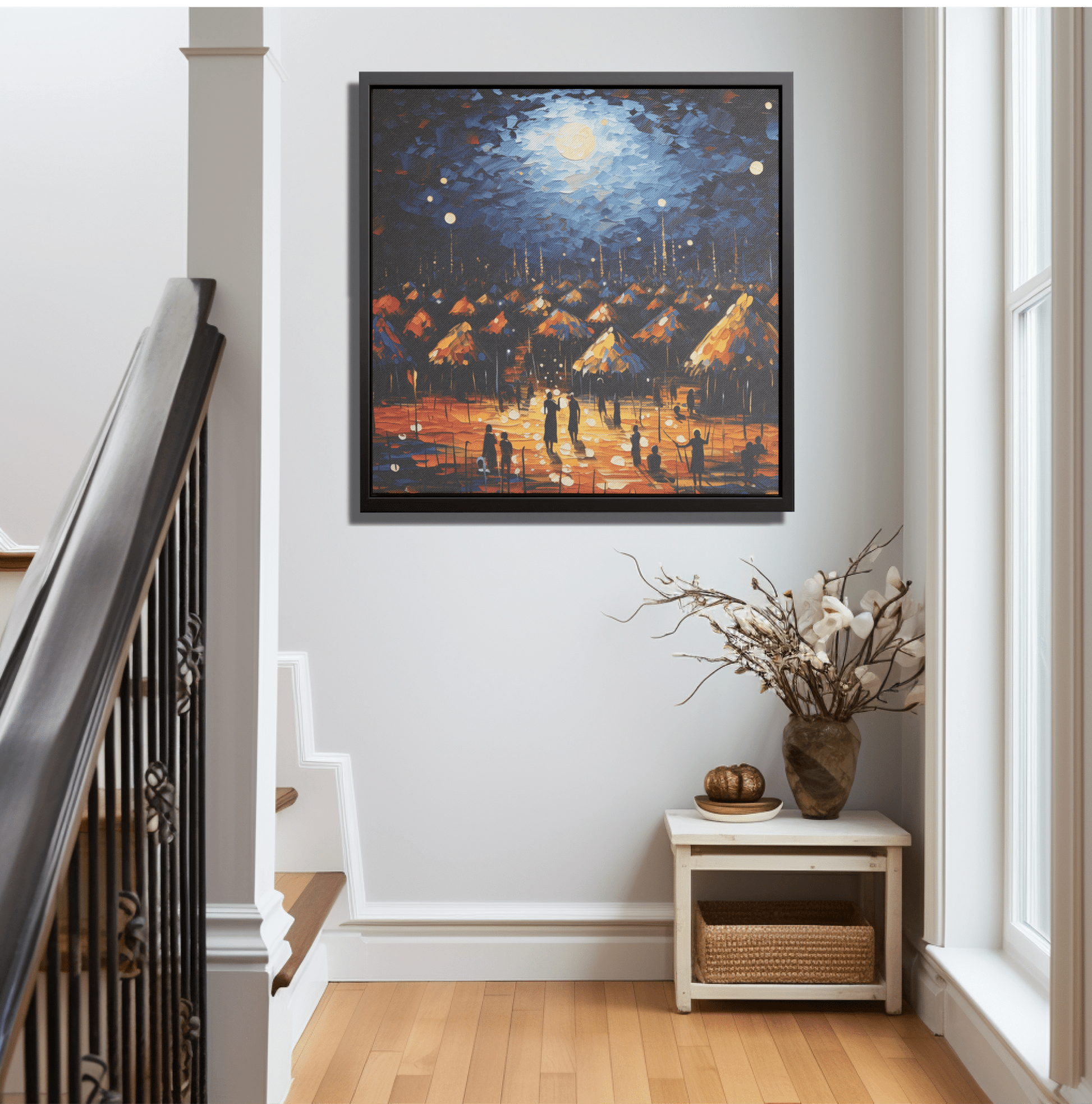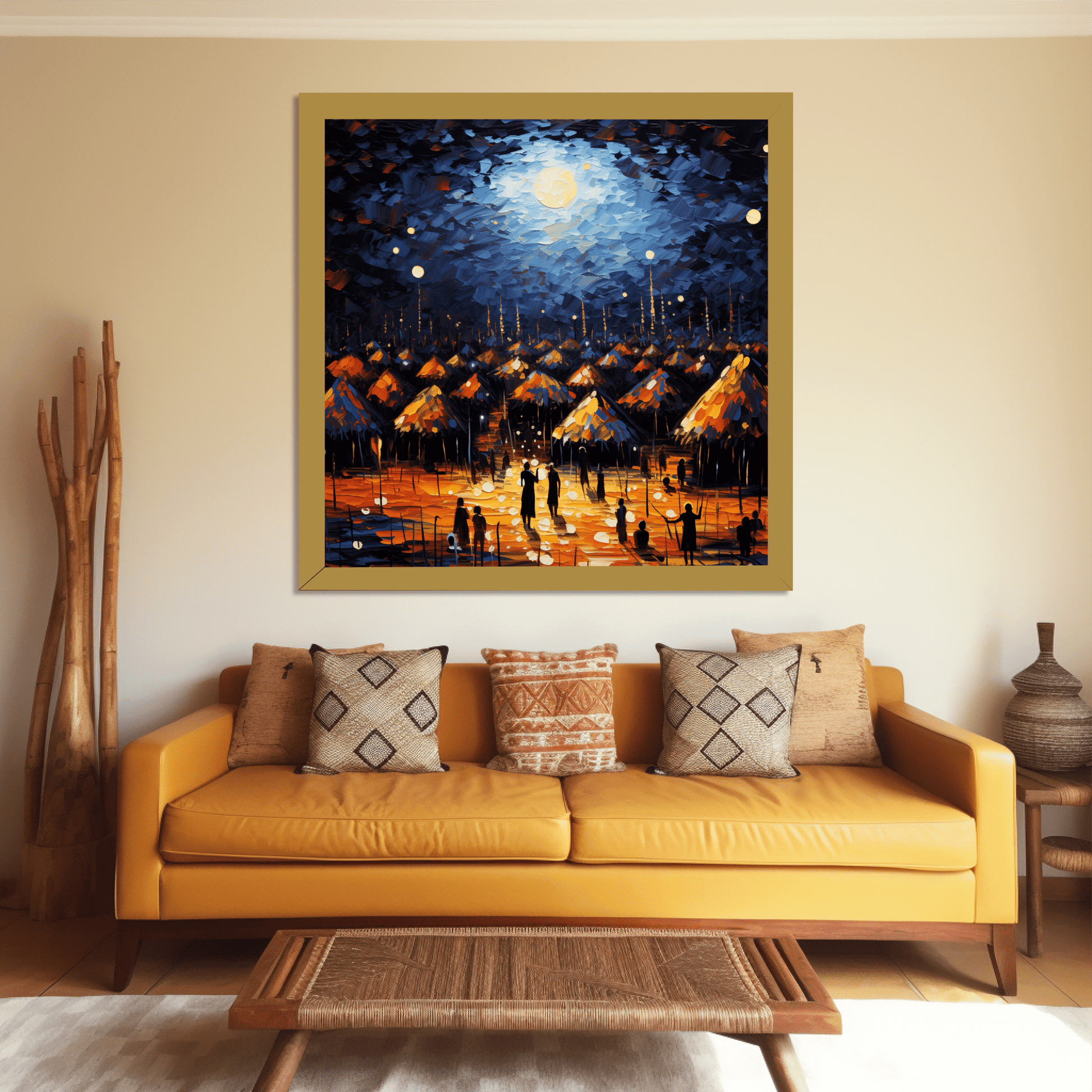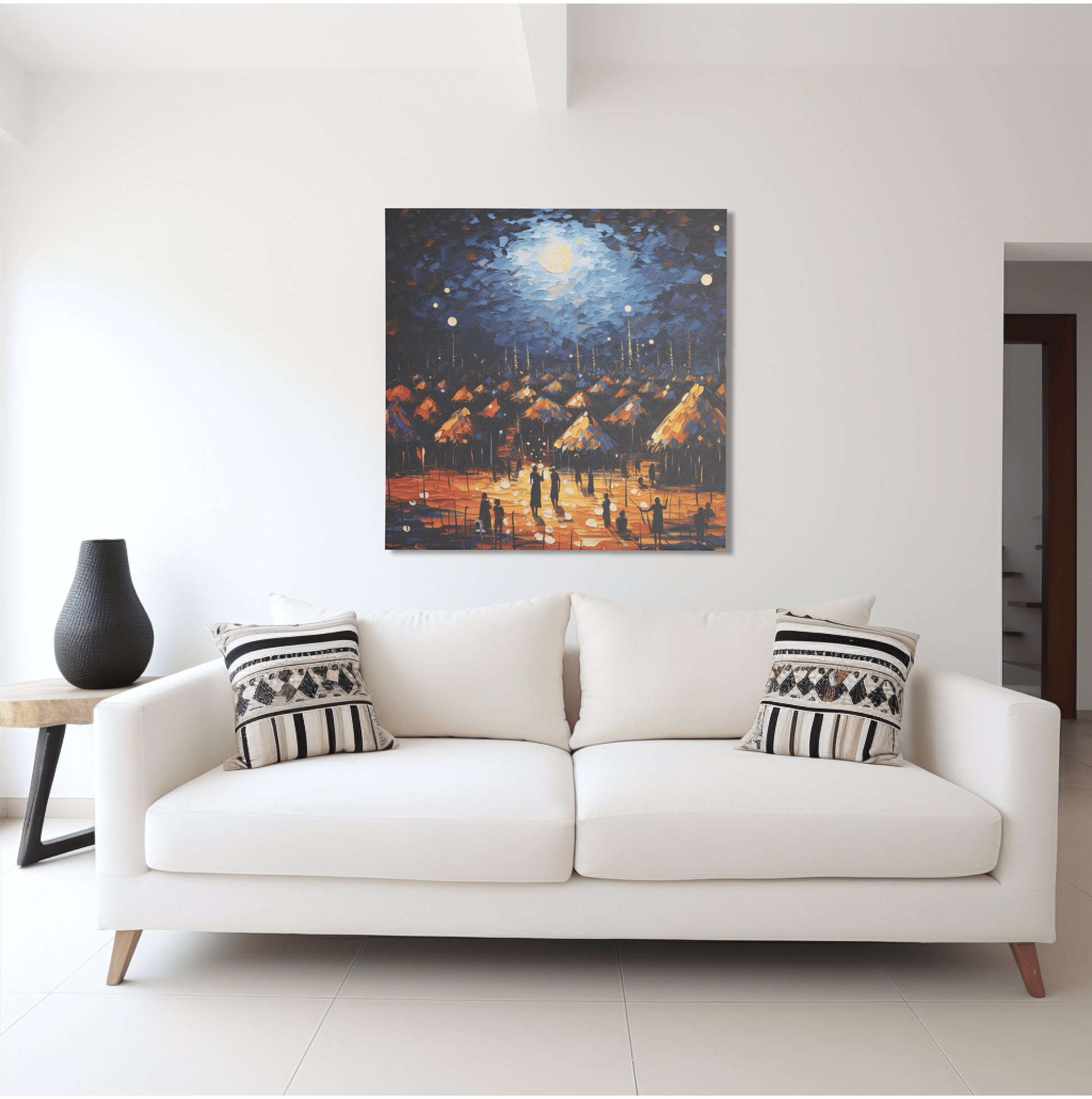 People around the homestead, with village huts in night sky, paint brush strokes.