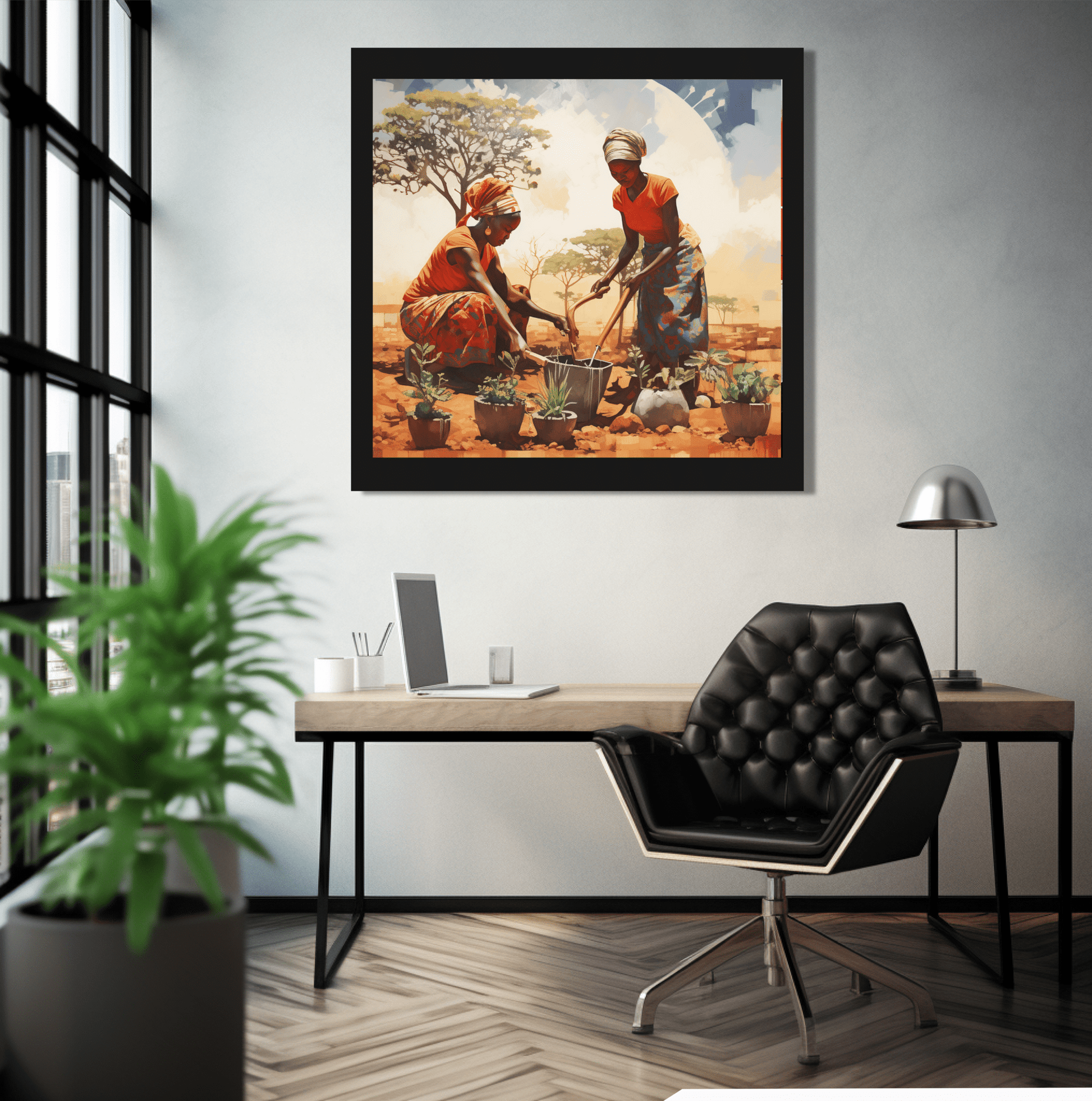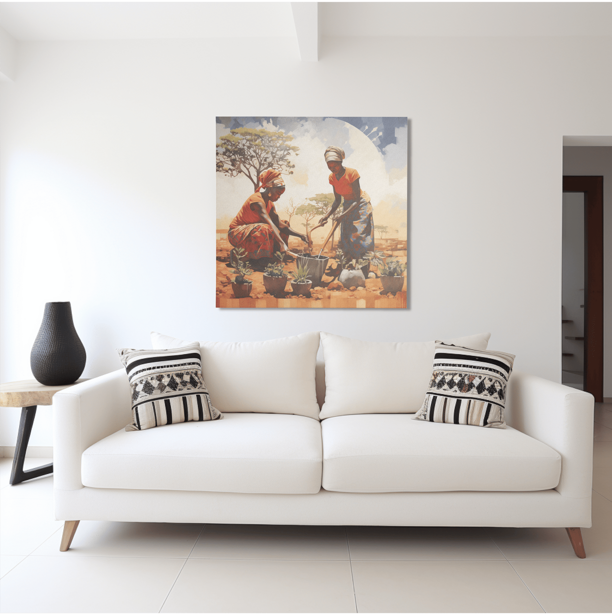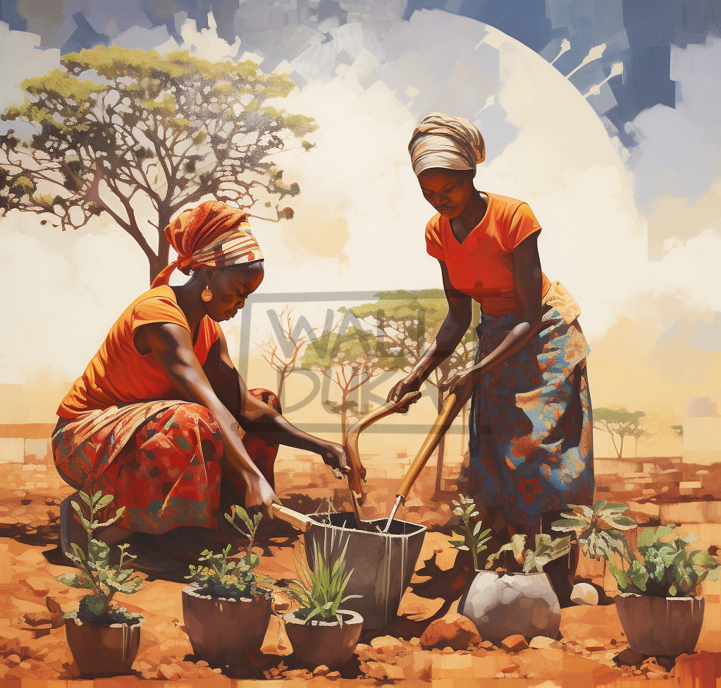 Two women tending to potted flowers.