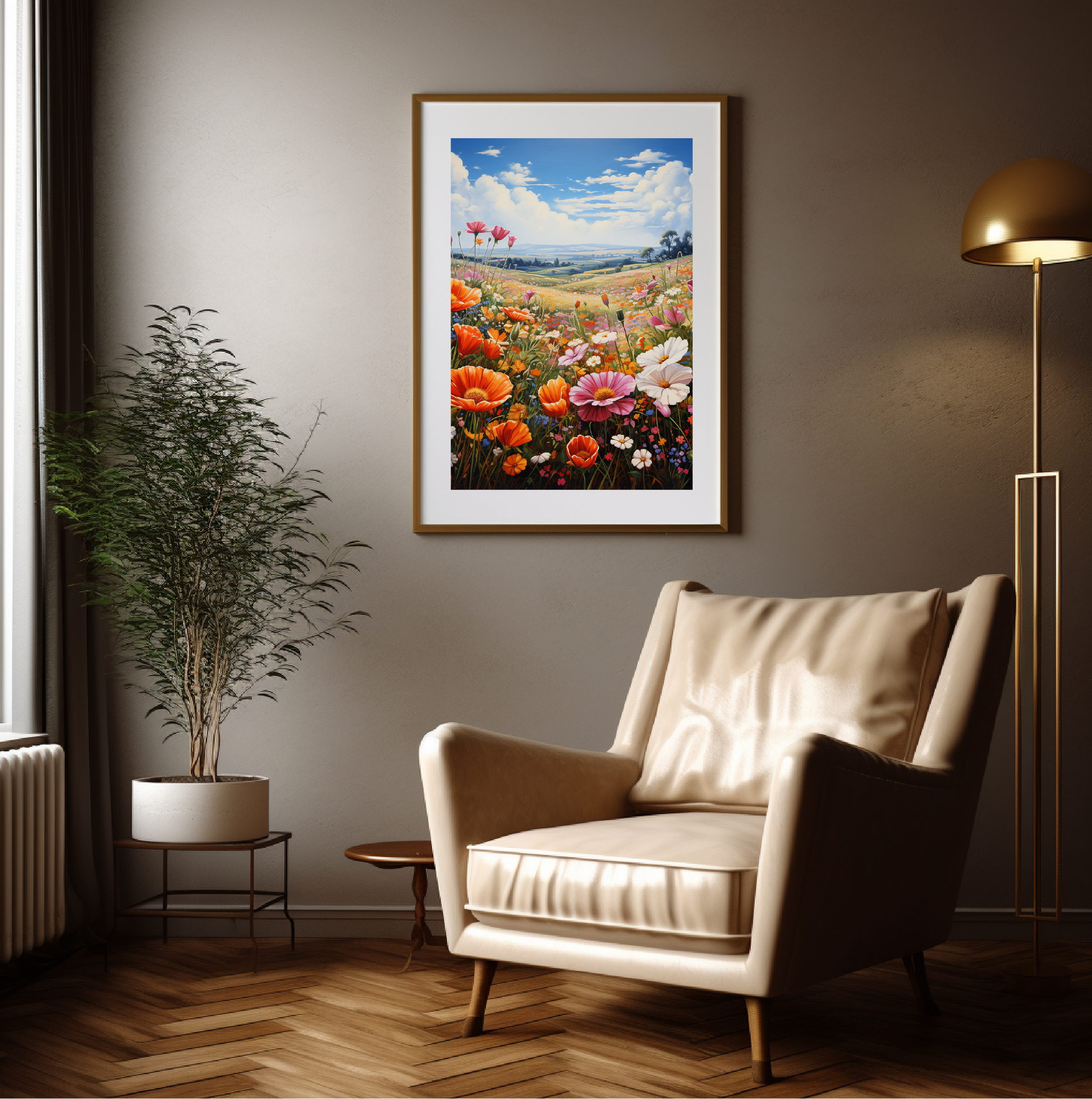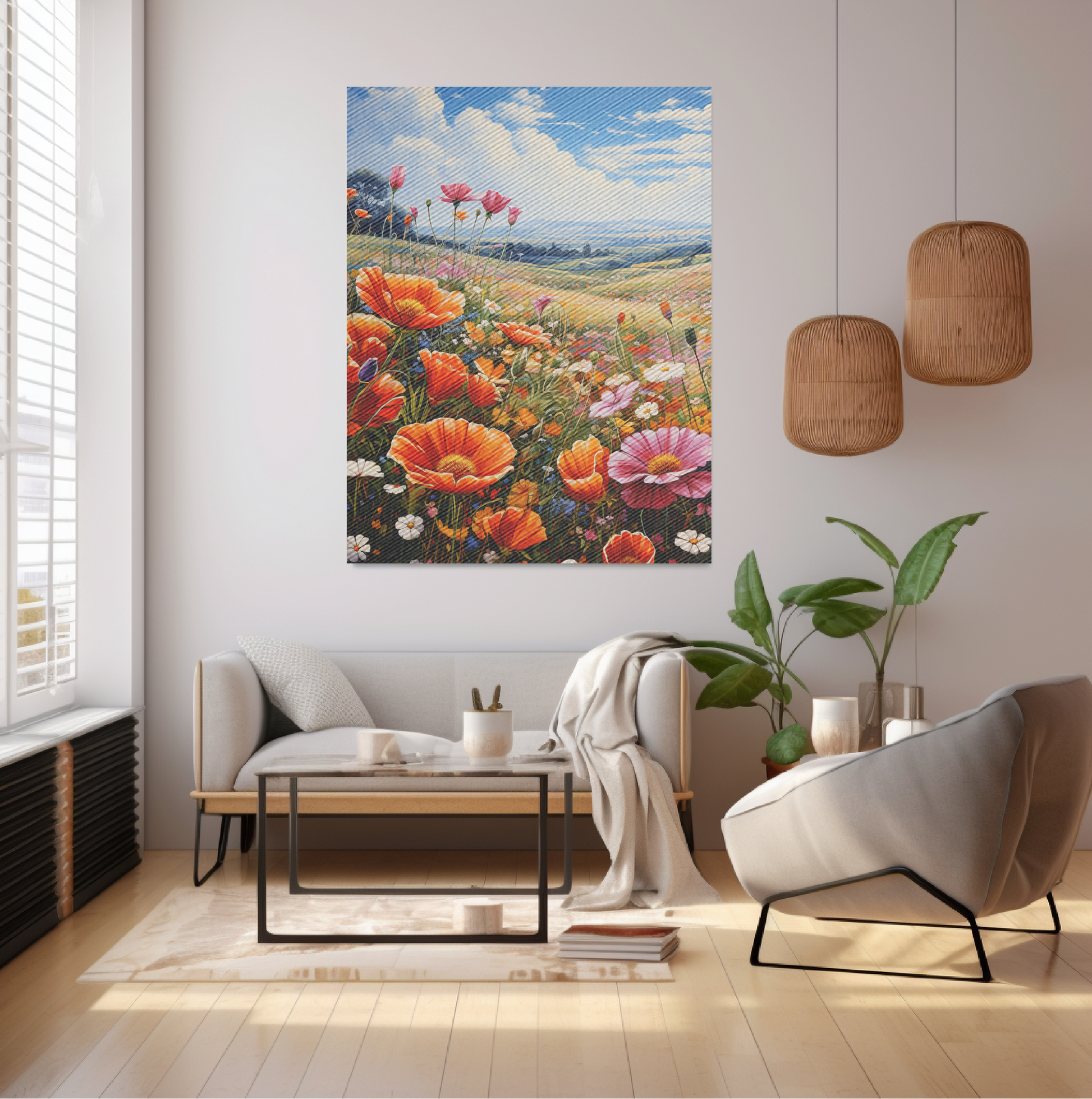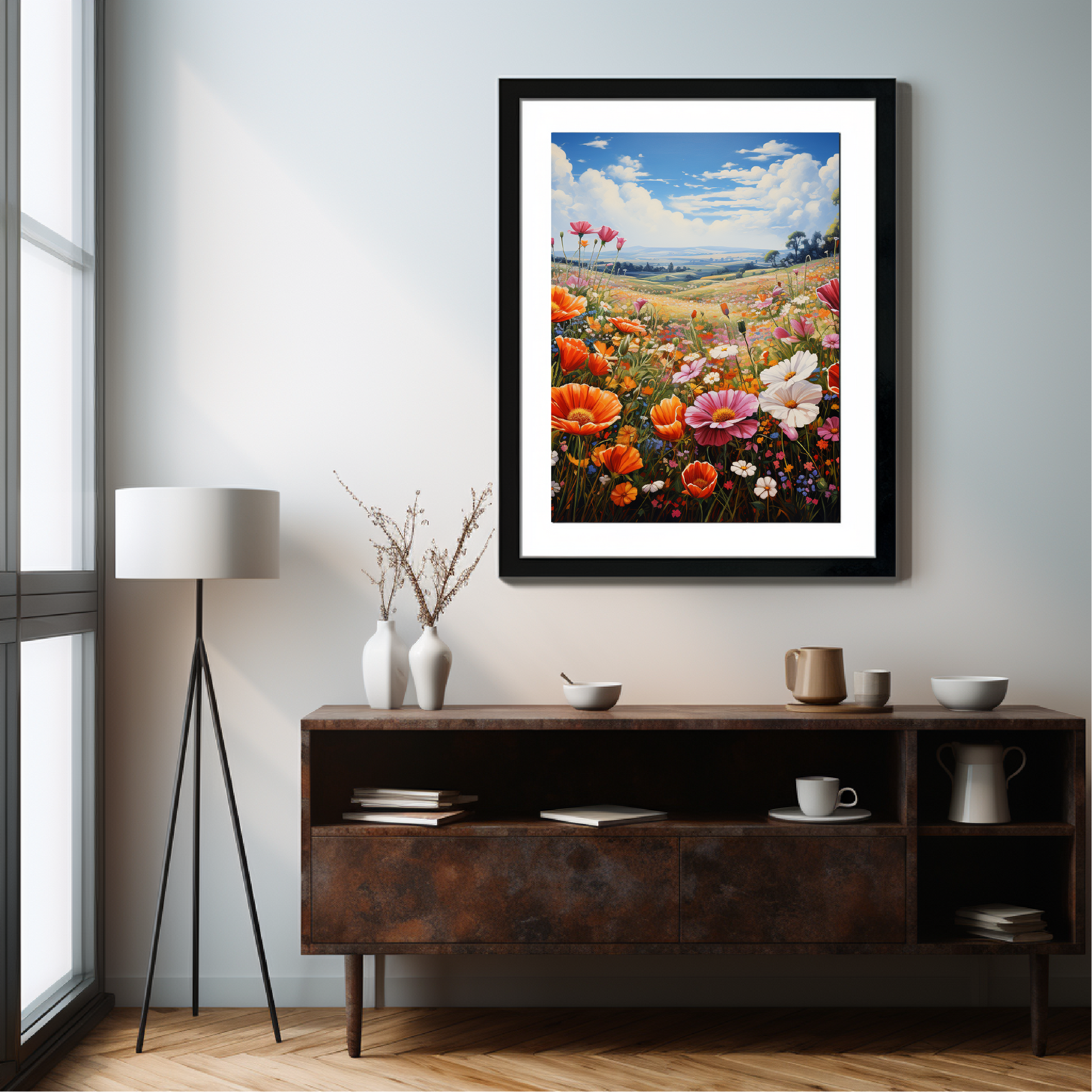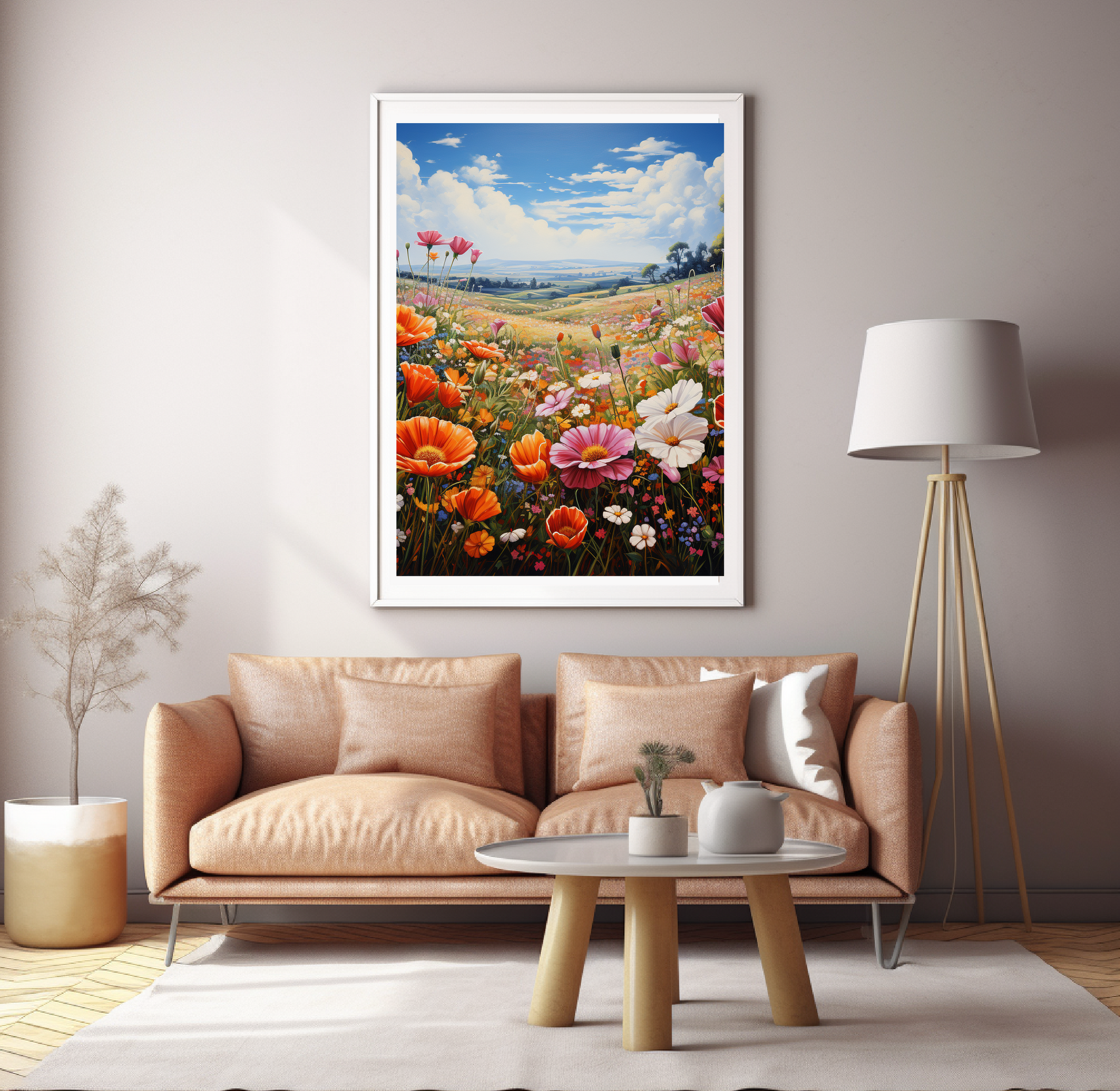 A flowery field under a beautiful day sky.