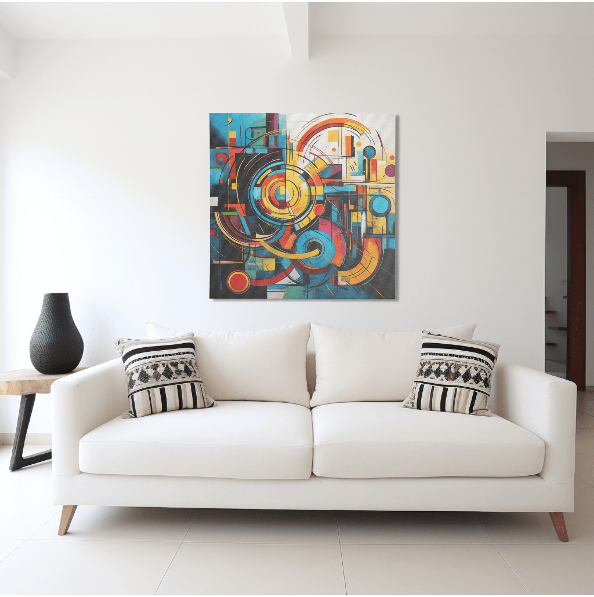 Energetic interplay of bold brushstrokes and geometric forms that stimulates creativity. Featuring circles, squares, triangles, or even more abstract shapes to create a sense of movement and visual interest with shapes dancing across the canvas.