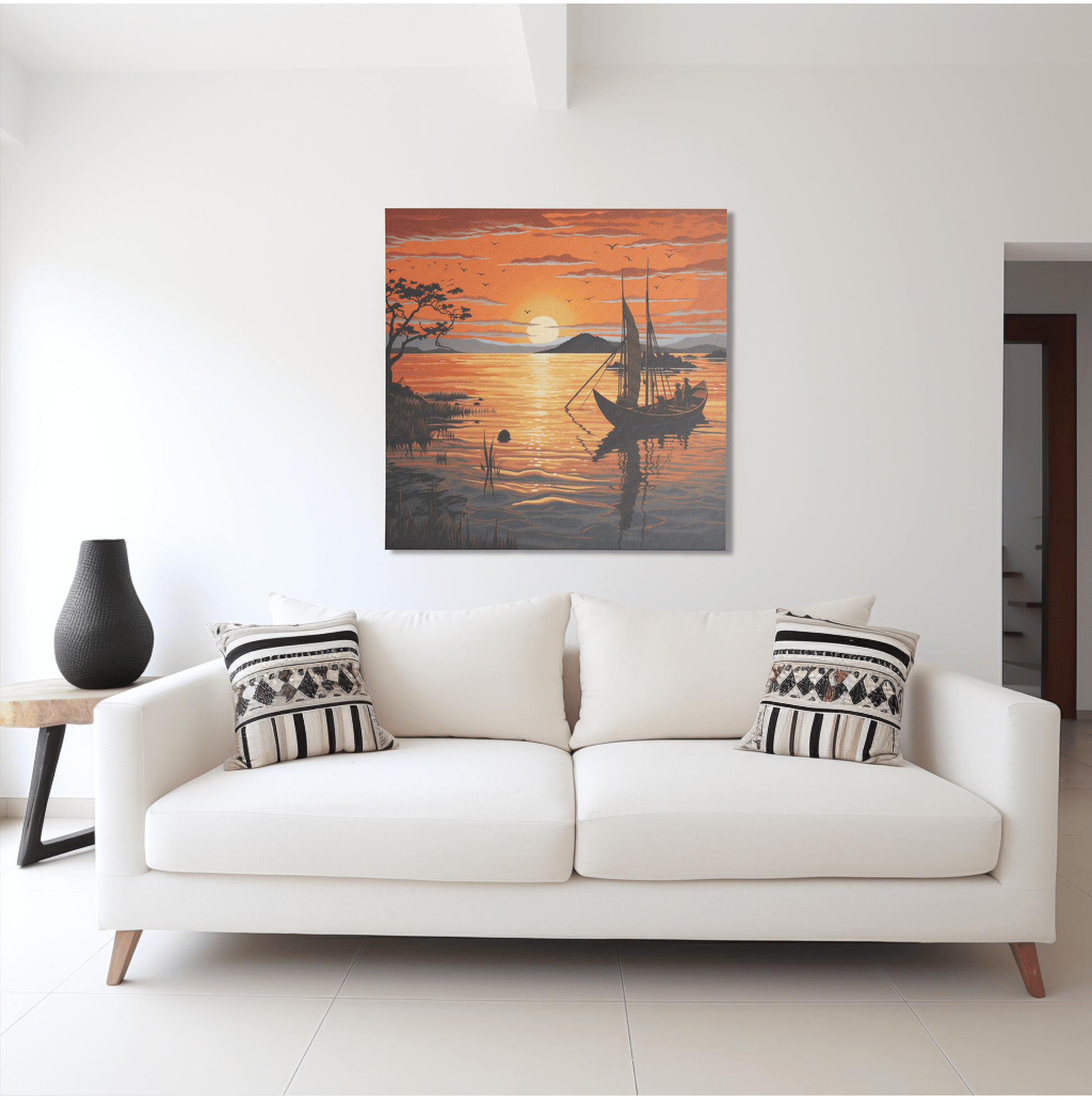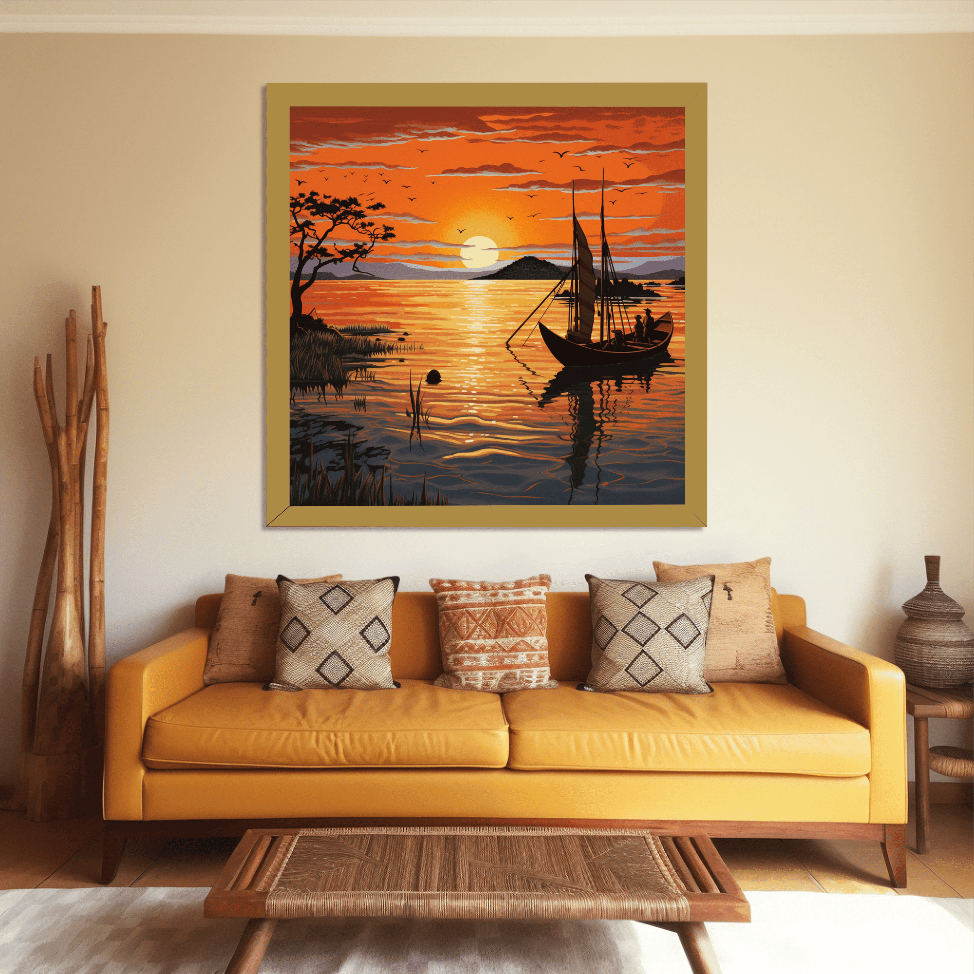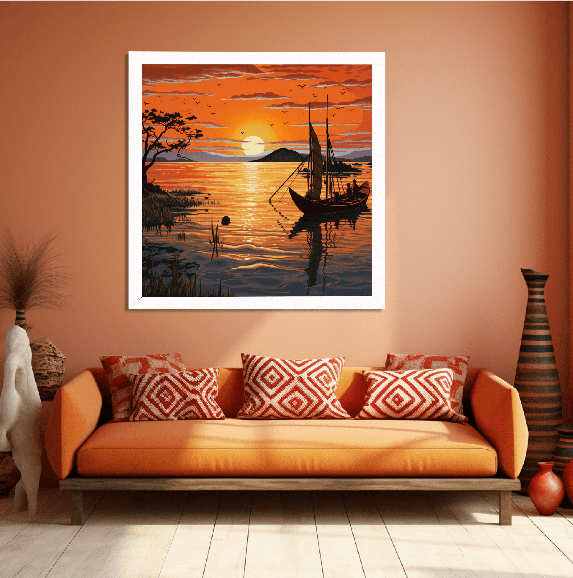 Boats on lake Victoria, sunrise, in the style of Ukiyo.