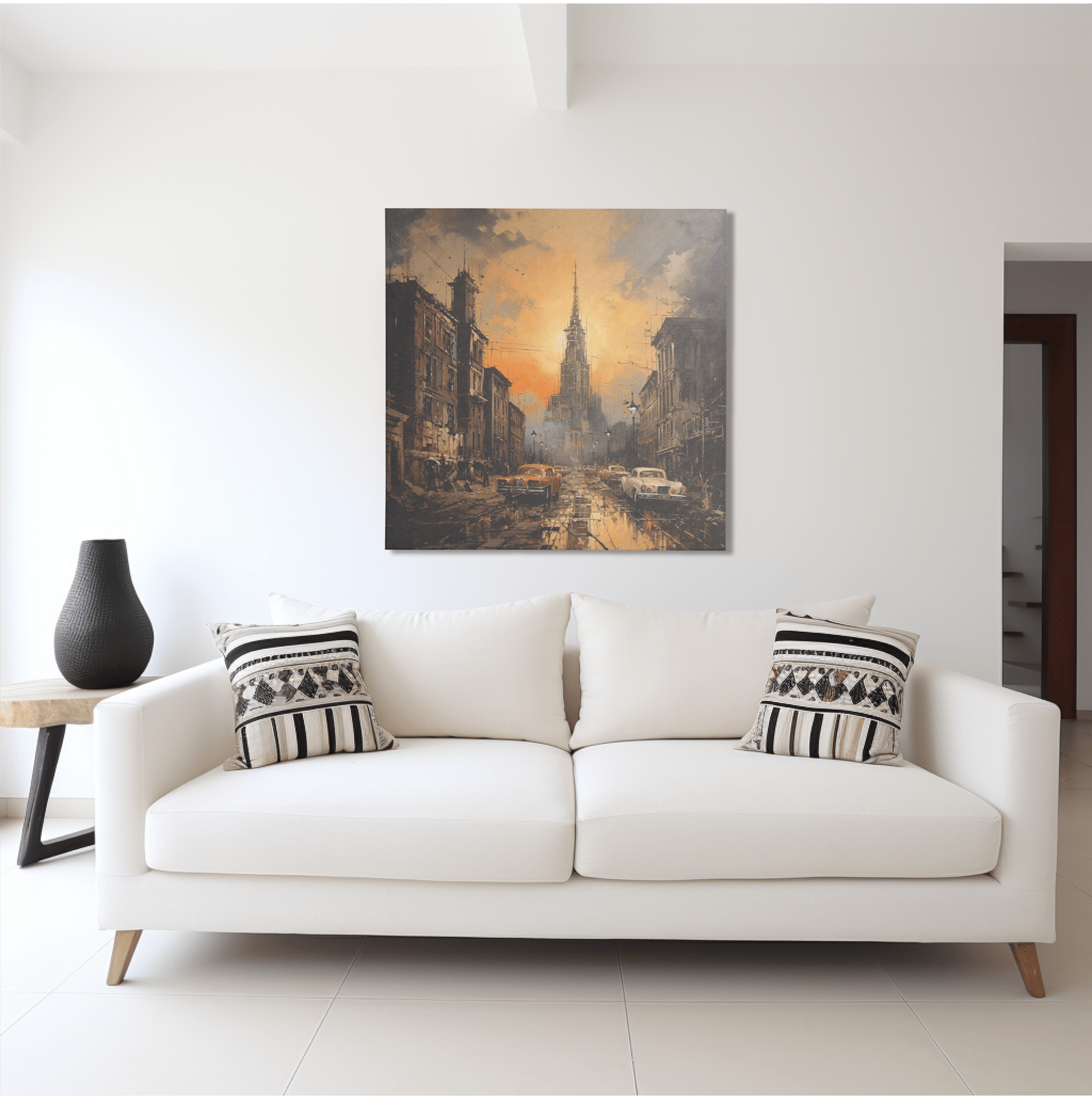 Vintage original oil painting of high buildings cityscape, in the style of Yuriy Pavlenko.