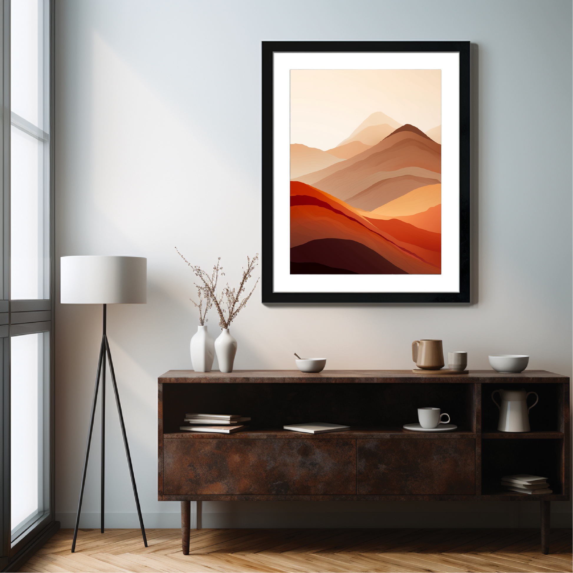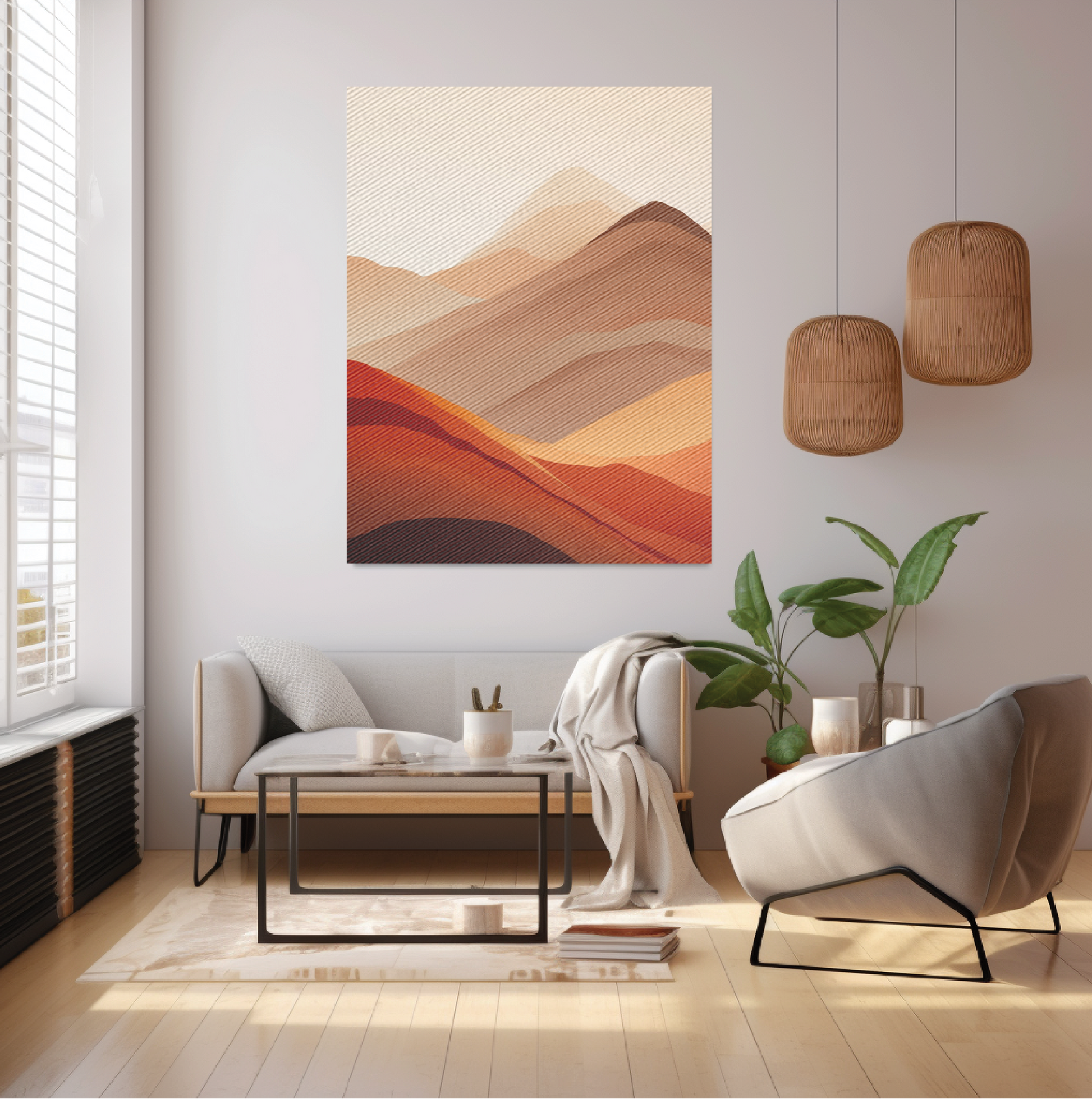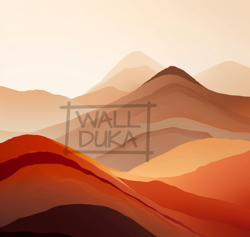 Watercolor painting of a desert landscape with a sun in the sky, in the style of graphic contours, digital fantasy landscapes, light beige and orange, low poly, organic and flowing forms, multilayered surfaces, horizons.