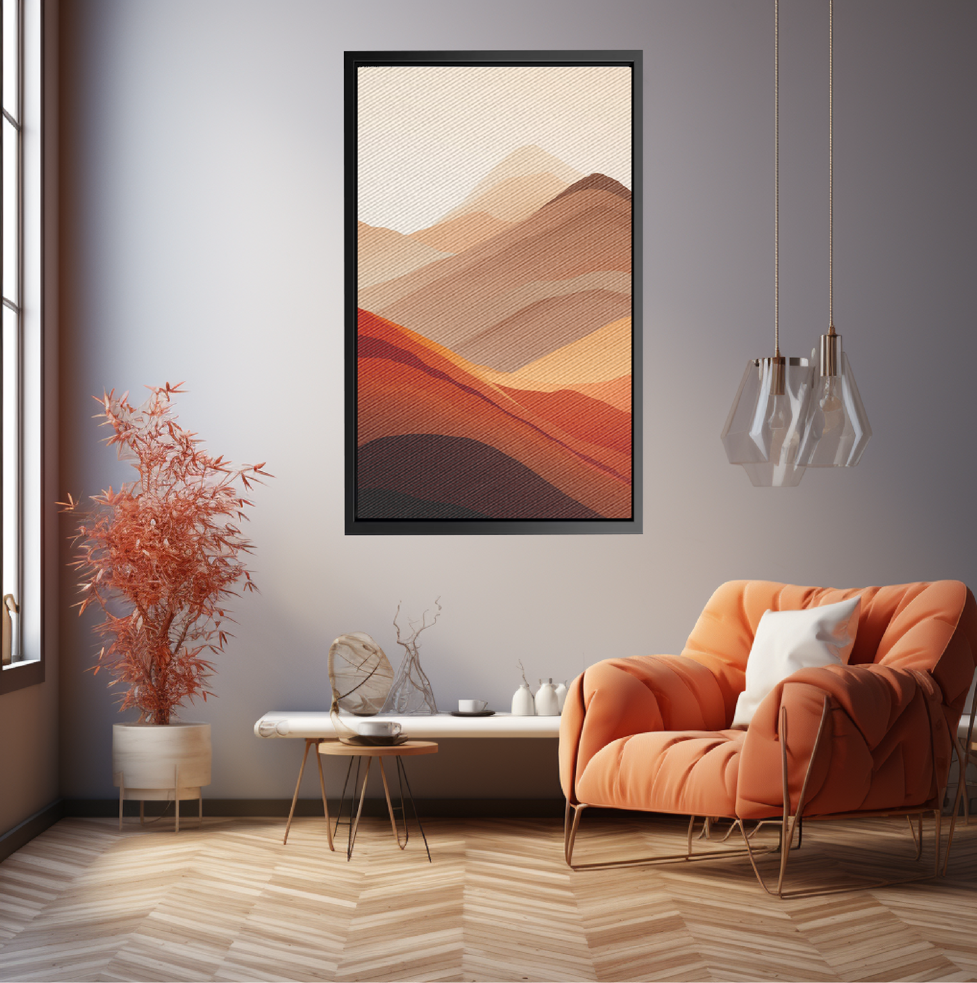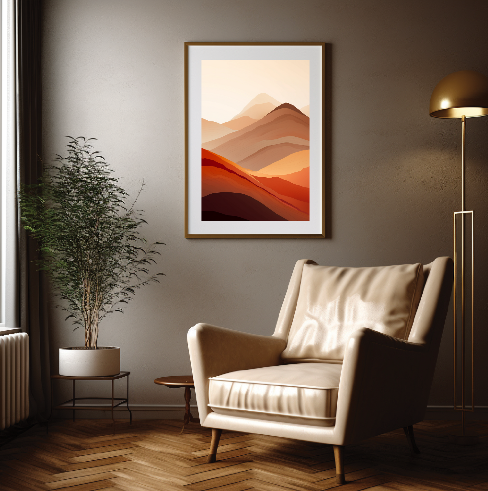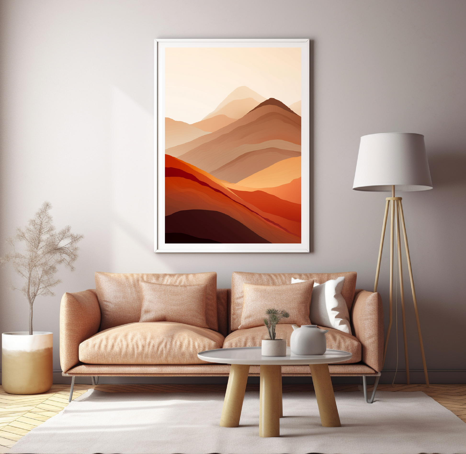 Watercolor painting of a desert landscape with a sun in the sky, in the style of graphic contours, digital fantasy landscapes, light beige and orange, low poly, organic and flowing forms, multilayered surfaces, horizons.