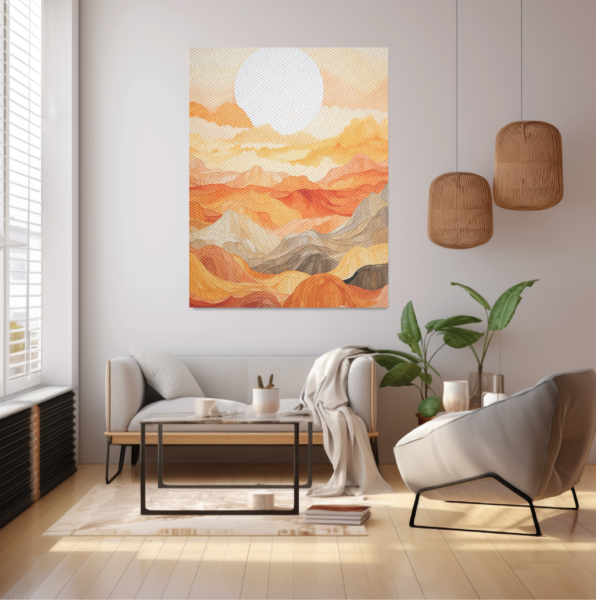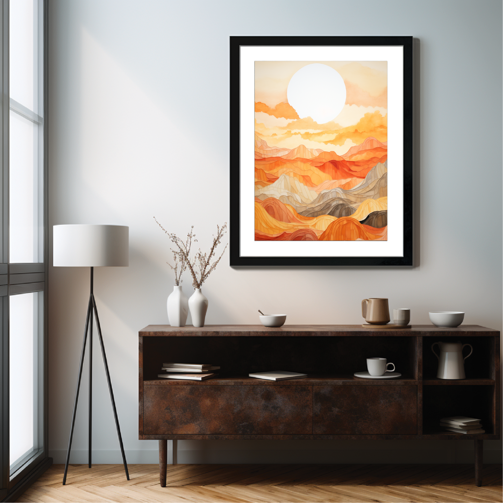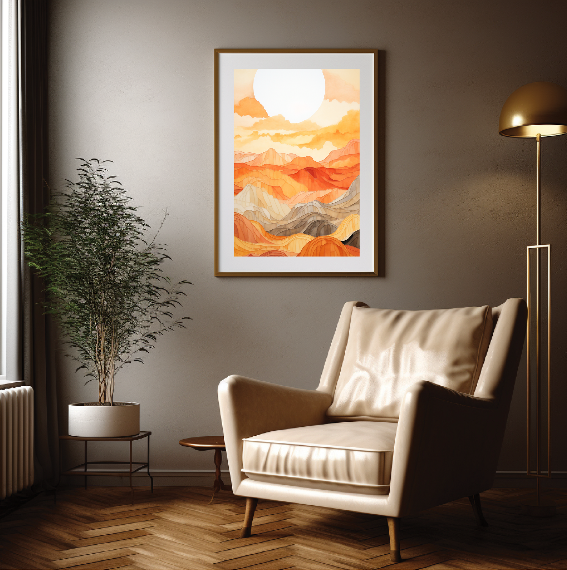 Watercolor sunset with red hills and mountains, in the style of minimalistic abstraction, brown and amber, multidimensional layers, smooth and curved lines, naturalistic landscape backgrounds